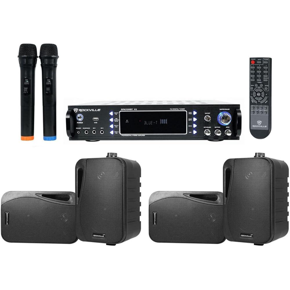 Package Includes: (1) RockvilIe RPA70WBT 1000w 2-Ch USB Bluetooth Pro/Karaoke Amplifier/Mixer+(2) Mics, (2) Pair of RockvilIe HP4S-8 BK 4″ Outdoor/Indoor Swivel Home Theater Speakers in Black