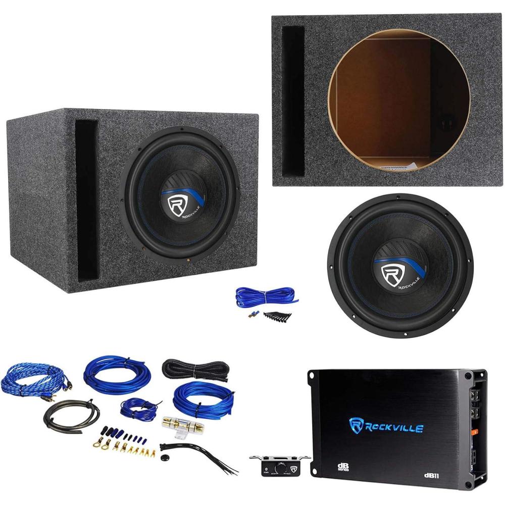 Package Includes: (1) RockvilIe K5 W12K5S2 12″ 1400w 2 Ohm Car Audio Subwoofer Sub 350w RMS CEA Rated!. (1) RockvilIe dB11 1400w/350w RMS Mono Class D 2-Ohm Amplifier Car Amp+Bass Remote. (1)RockvilIe RWK81 8 Gauge Complete Amp Installation Wire Kit with 100 % Copper RCA. (1) RockvilIe RSV12 Single 12 1.22 cu.ft. 3/4″ MDF Vented Subwoofer Enclosure Box. 10 Drywall Wood Screws (Wood screws are the type of screws; the screws are actually made of metal). 12 Feet of 14 AWG Blue Speaker Wire