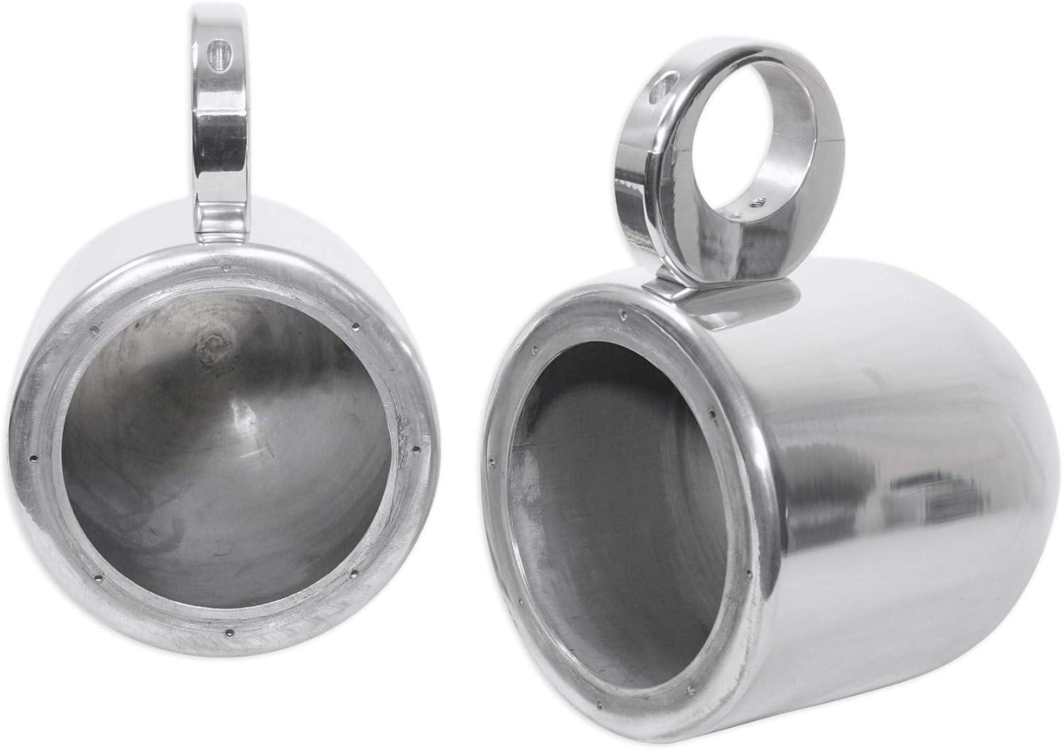 Features: Pair of Rockville MAC65S polished chrome aluminum can wakeboard tower enclosures. Made of high quality 6061 aircraft grade aluminum. Hand polished for beautiful chrome finish. 100% waterproof and fully marinized against salt and fresh water conditions. Internally wired for clean install—no exposed wires or terminals. High efficiency design features the perfect airspace for 6.5” speakers. Rugged universal mounting clamps made of 6061 aluminum.