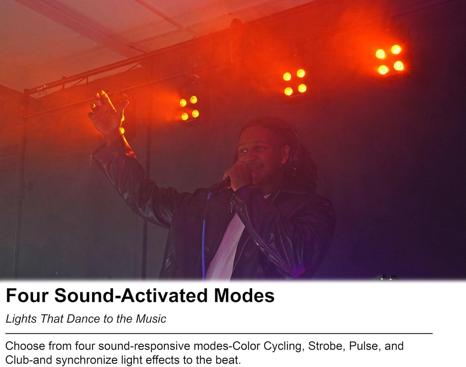 SOUND-ACTIVATED MODES: Includes 4 dynamic sound modes-cycling, strobing, pulsing, and club mode-with adjustable mic sensitivity and brightness, ideal for DJs, weddings, and parties.