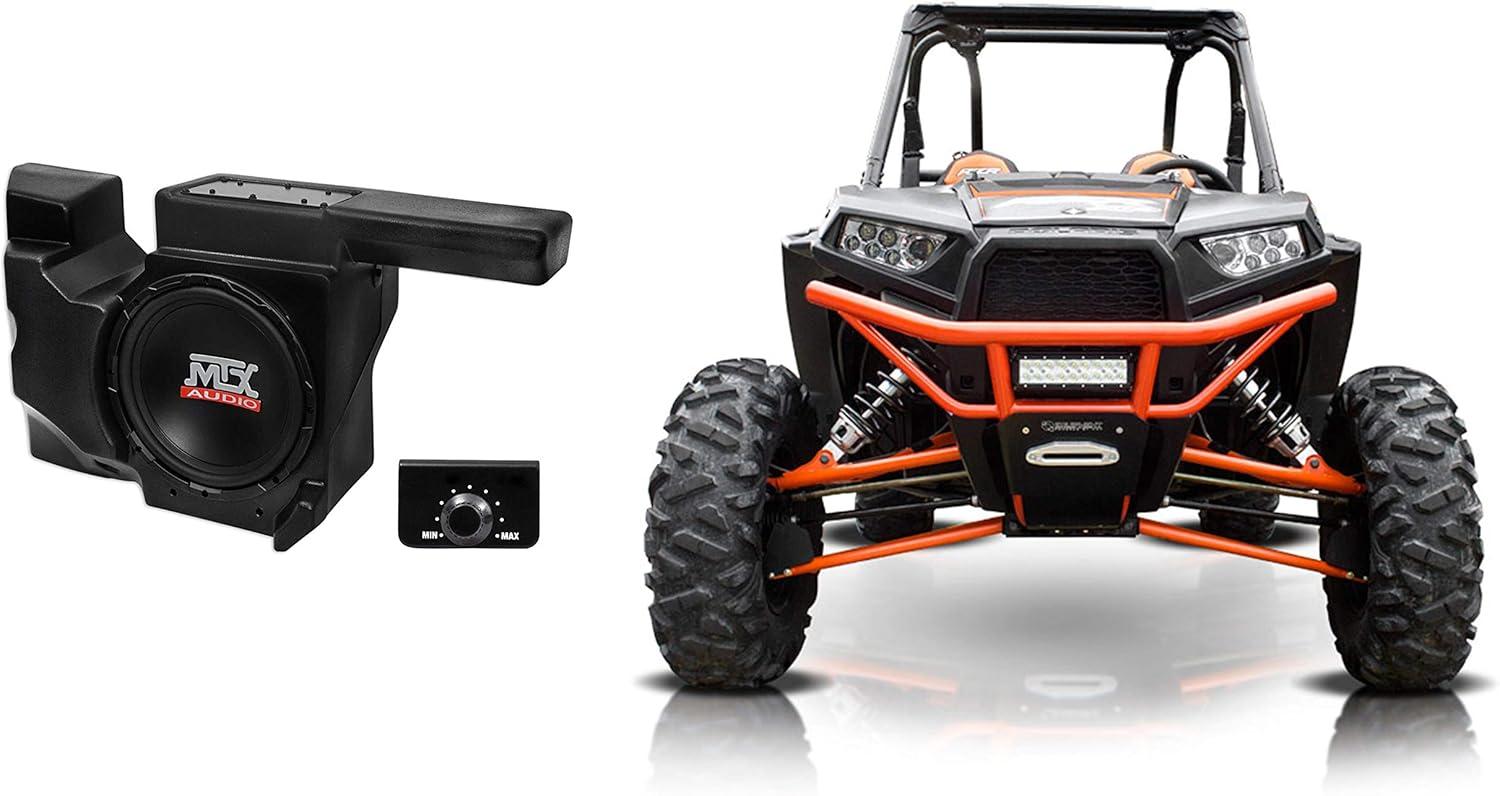 Features of RZRXP-10: MTX RZRXP-10 Powered 10″ 500w Under Dash Subwoofer+Enclosure 4 Polaris RZR/UTV, Integrated 250-Watt RMS Amplifier, Low Level Input with External Gain Control, Dash Mount External Bass Control Included, Mounts Underneath Dashboard on Select RZR Models, No Cutting or Drilling Required, Will not Fit Vehicles with Added Heater Accessory, RMS Power (Watts): 250, Peak Power (Watts): 500.