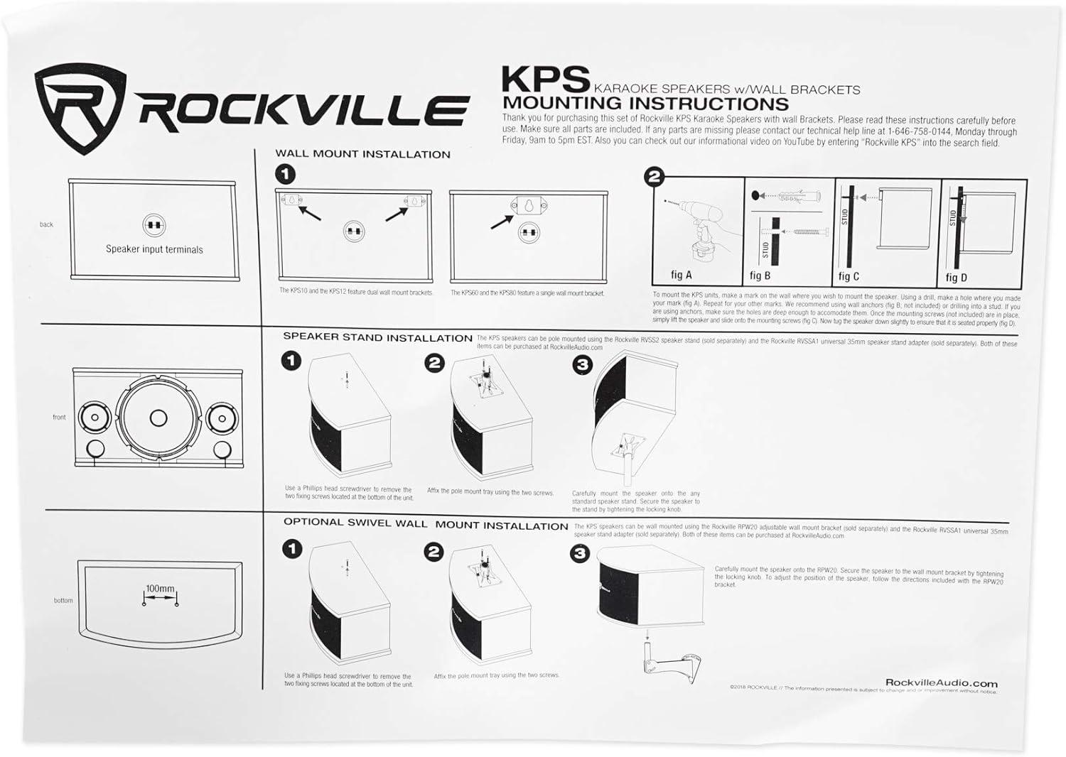 Package Includes: (1) Pair of RockvilIe KPS80 8″ 3-Way 800 Watt Karaoke/Pro Speakers+Wall Brackets / MDF!. (1) RockvilIe RPW20 Pair Adjustable Wall Mount Brackets for PA Speaker Installations. (2)RockvilIe RVSSA1 Universal 35mm Mounting Tripod Pole Speaker Adapter Bracket. Features ofKPS80: Pair RockvilIe KPS80 8″ 3-Way 800 Watt Karaoke Speakers with Wall Brackets and MDF Enclosure. Peak Power: 1600 Watts Per Pair (800 Watts Each). Program Power: 800 Watts Per Pair (400 Watts Each)