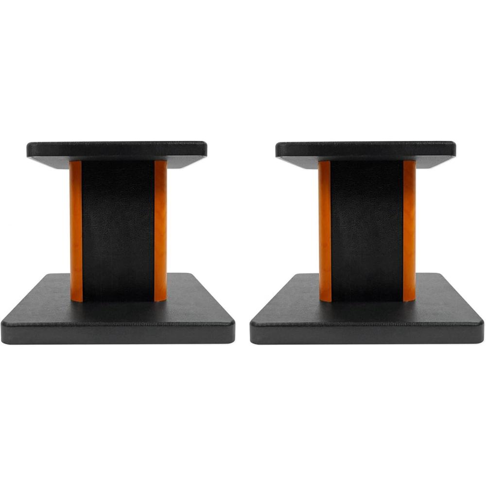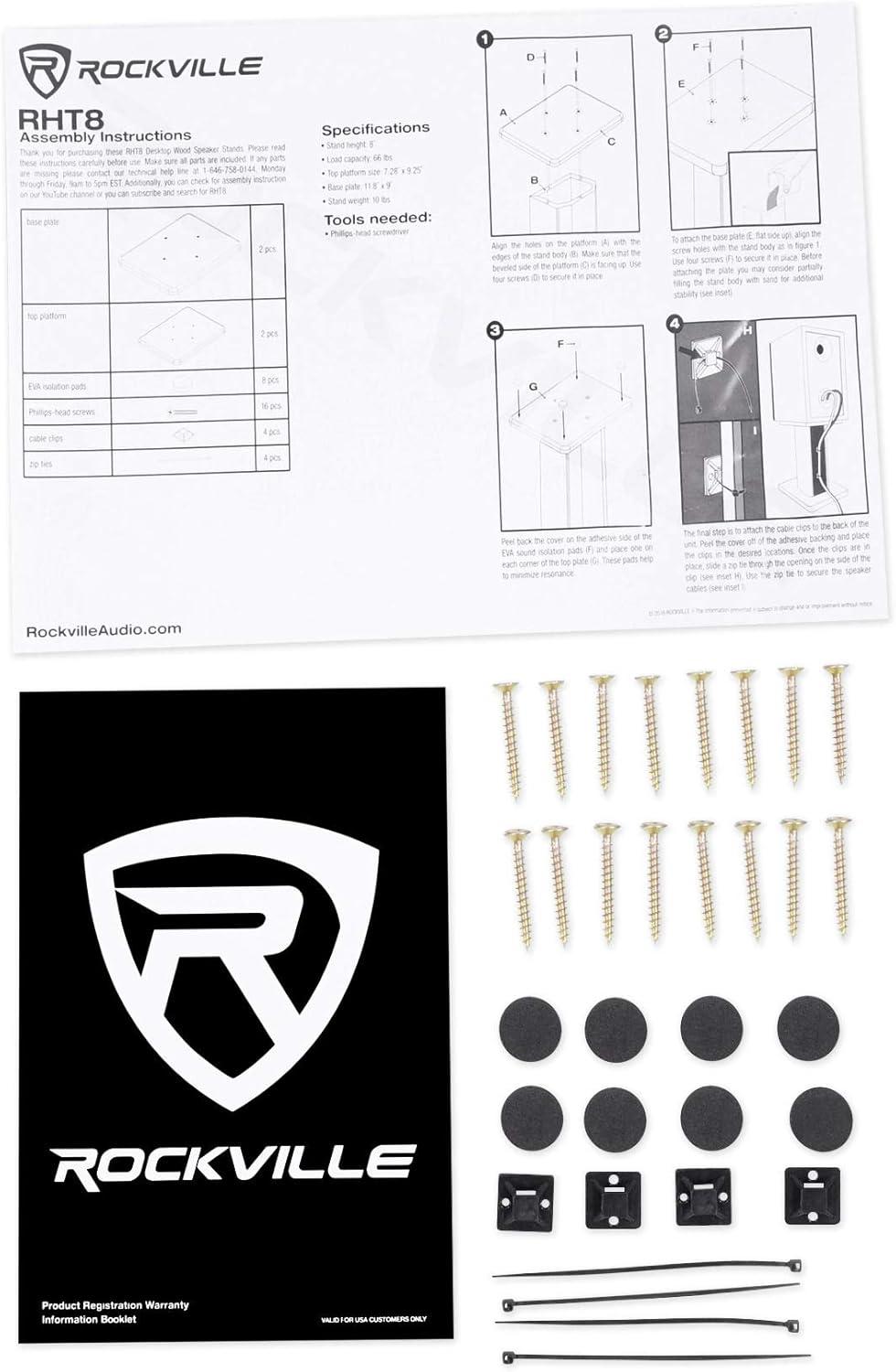 Description: The Rockville RHT8C high performance Desktop wood speaker stands are designed with appearance, performance, and quality in mind. These stands are perfect for Computer speakers, Bookshelf speakers, and studio monitors! Our stands are finished with premium furniture-grade paint that will not crack, chip, or peel. These stands are constructed from high quality medium density fiber core to minimize resonance. Unlike our competitors who use particle board we use a higher quality wood in the construction of our stands. With the included EVA speaker isolation pads you can feel confident that your speakers will be sturdy and perform optimally. The load capacity of these stands are 66 lbs. Most other stands on the market have a maximum load capacity of 20 lbs. which really is not enough for a lot of speakers on the market. These stands are sturdy, built well, look great, and out-perform the competition so buy with confidence!