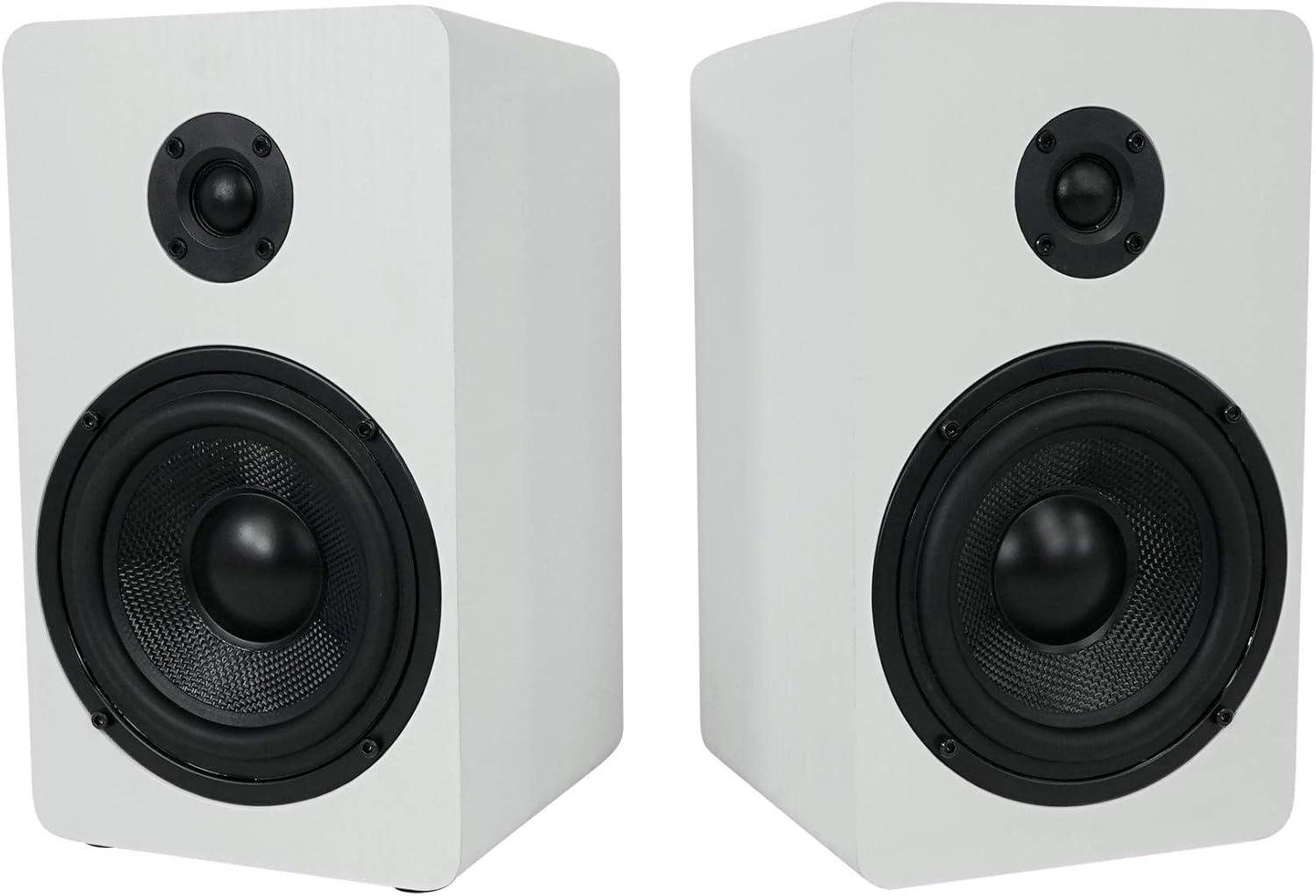 Cabinet material: Top quality MDF with beautiful wood grain finish. Audiophile-grade black kevlar woofer cone for excellent mid and low frequency response. Silk dome tweeter gives crisp and realistic sounding highs that you cant get with any other kind of tweeter. Gold-plated 5-way binding post terminals can accept banana, bare wire, spade terminals, and more. Wall mount hanging bracket. Impedance: 4 ohm. Color: White. Ultra-stiff Polypropylene dustcap on woofer. Rubber surrounds on woofer