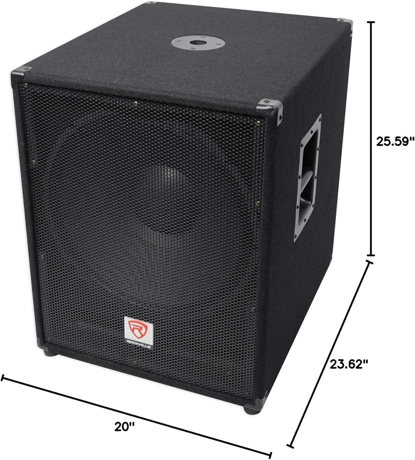 Package Includes: (1) RockvilIe PBG18 18″ Passive 2000 Watt 8 Ohm Pro Audio Subwoofer Sub/MDF Cabinet. (1) RockvilIe ISO 12-18 Isolation Platform Acoustic Riser Pad 12″/15″/18″ Subwoofers. Features: RockvilIe PBG18 18″ 2000 Watt Passive Pro Subwoofer w/ MDF Cabinet and Pole Mount. 18 Pro audio woofer. 1,000 Watts RMS Power. 1,500 Watts Program Power Handling. 2,000 Watts Peak Power. 4 KSV voice coil. 100 oz. woofer magnet. Vented Enclosure for Improved Bass Response
