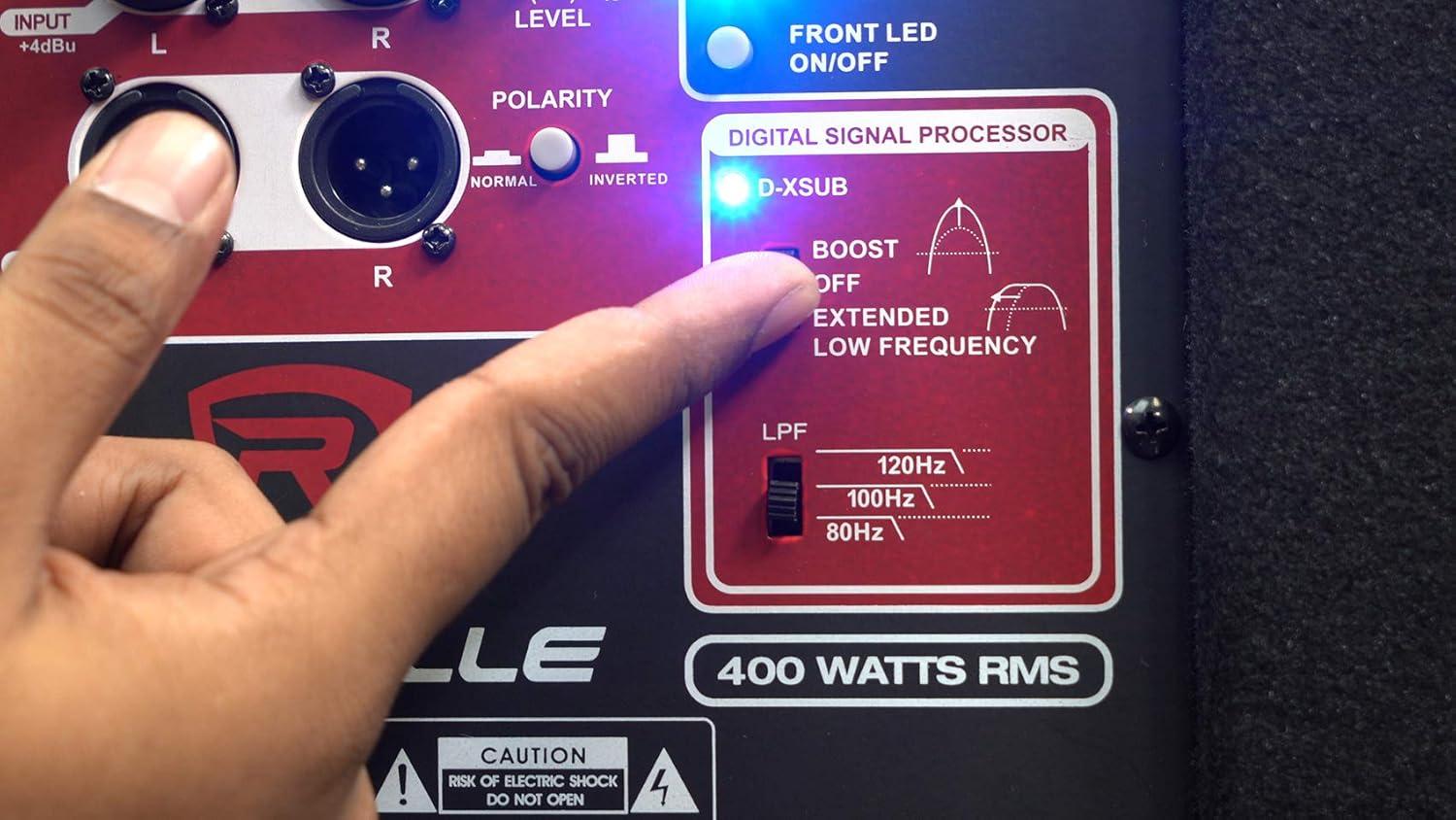Digital Signal Processor with Boost for Extended Low Frequency Control; Power-On and Signal Input LED Indicators; Signal Input LED Indicator; Clip Limiter Circuitry with LED Indicator; Balanced XLR and TRS input jacks
