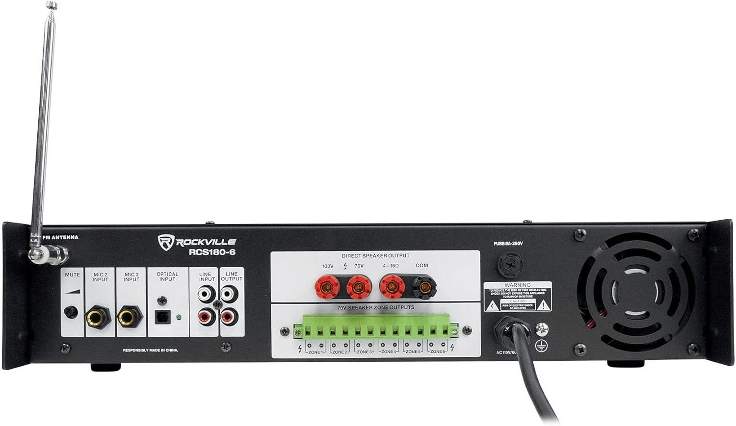 Rockville RCS180-6 6-Zone Amplifier Control: The Rockville RCS180-6 delivers 180-Watts of total power with support for 70V, 100V, 8-Ohm, and 4-Ohm systems, allowing flexible system design. Six independent speaker zones each feature individual volume controls, making it easy to balance sound across multiple rooms. Rack-mountable design with detachable euro-block terminals simplifies professional or DIY installation in commercial or home multi-room environments.