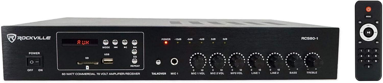 RCS80-1 Power & Inputs: 70/100V (60W RMS), 4-Ohm (80W), 8-Ohm (70W), 16-Ohm (11W). Bluetooth, FM tuner, USB/SD inputs, (2) RCA AUX inputs, (2) mic inputs, and RCA REC output.