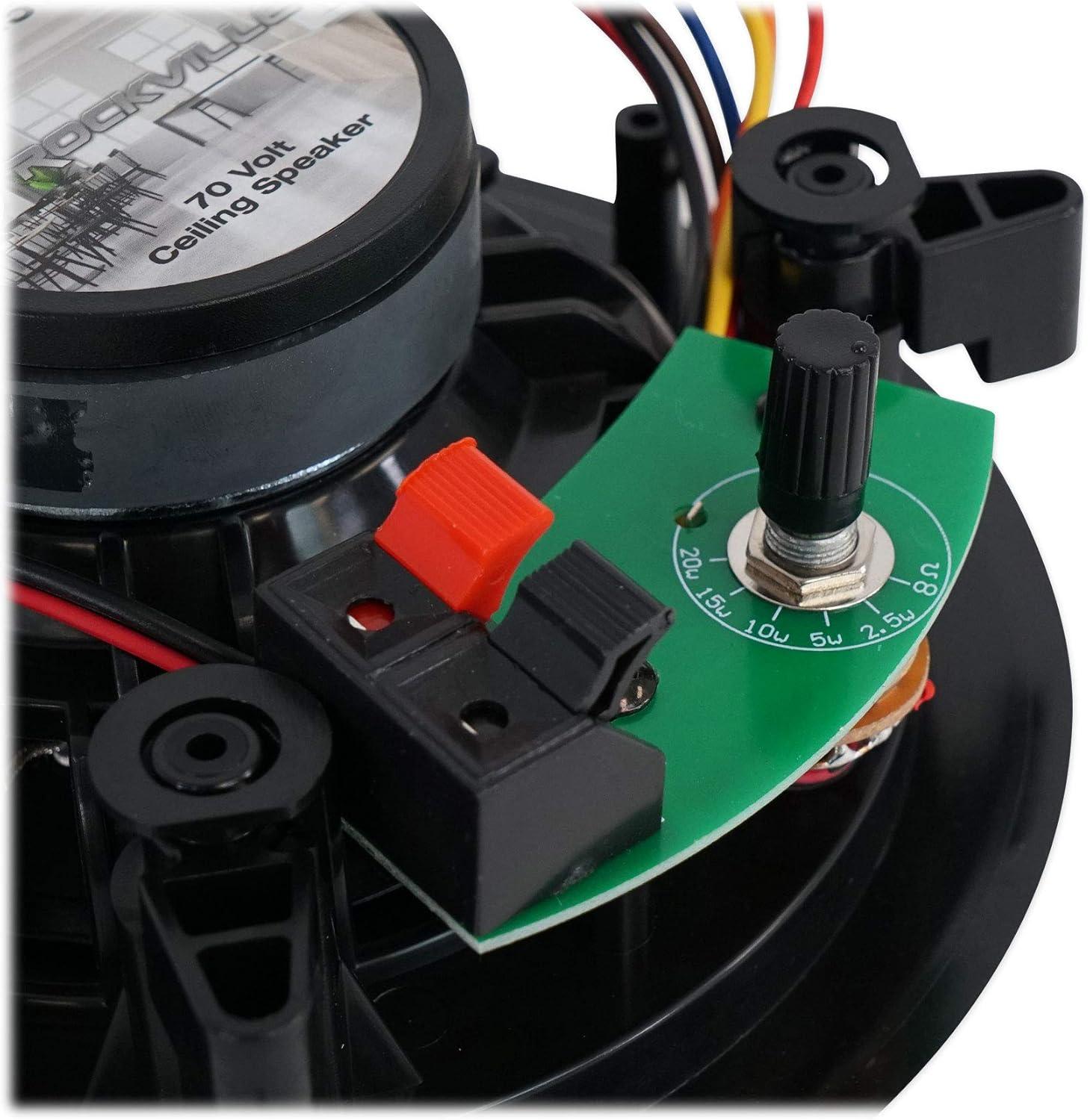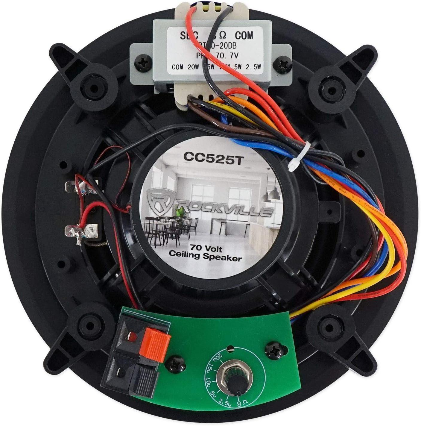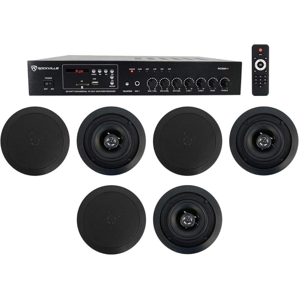 Package Includes: (1) Rockville RCS80-1 60-Watt 70V Amplifier/Bluetooth Receiver, (3) Pair Rockville CC525T Black 5.25″ 70V In-Ceiling Speakers (6 speakers total).