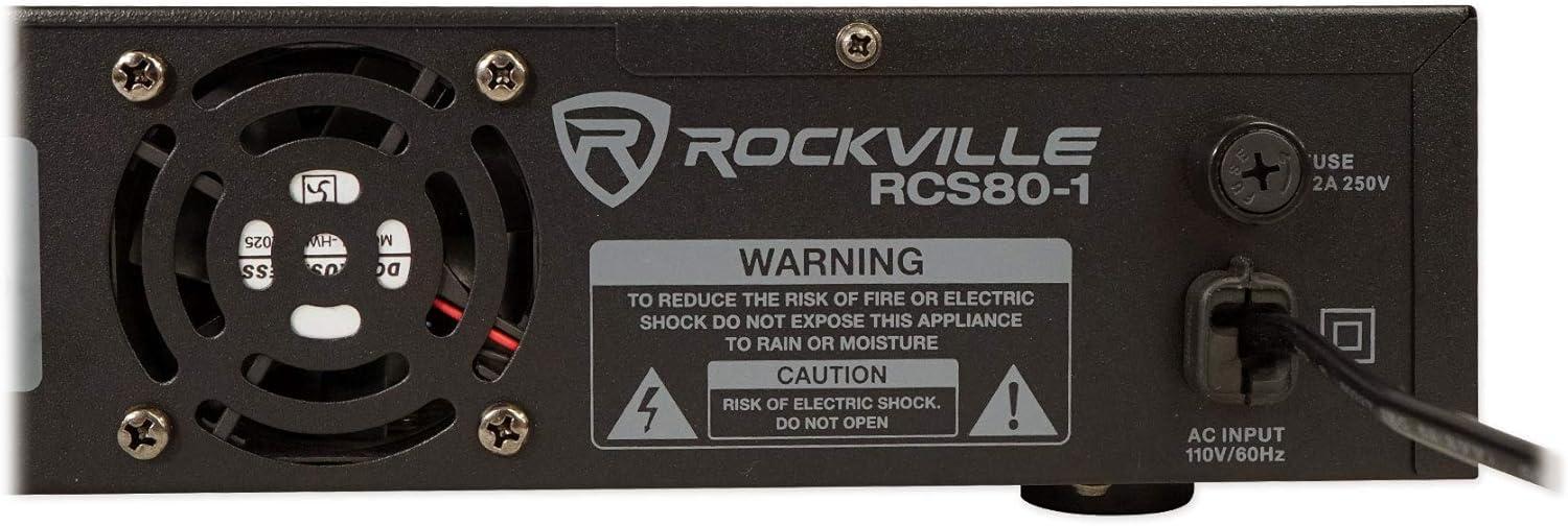 RCS80-1 Controls & Specs: Separate volume controls for mics, MP3, and line inputs plus bass/treble controls. Dimensions: 16.9″ x 9.45″ x 2.76″; Weight: 10.03 lbs. Includes remote control, rack mount ears, power cable, FM antenna, and owner's manual.