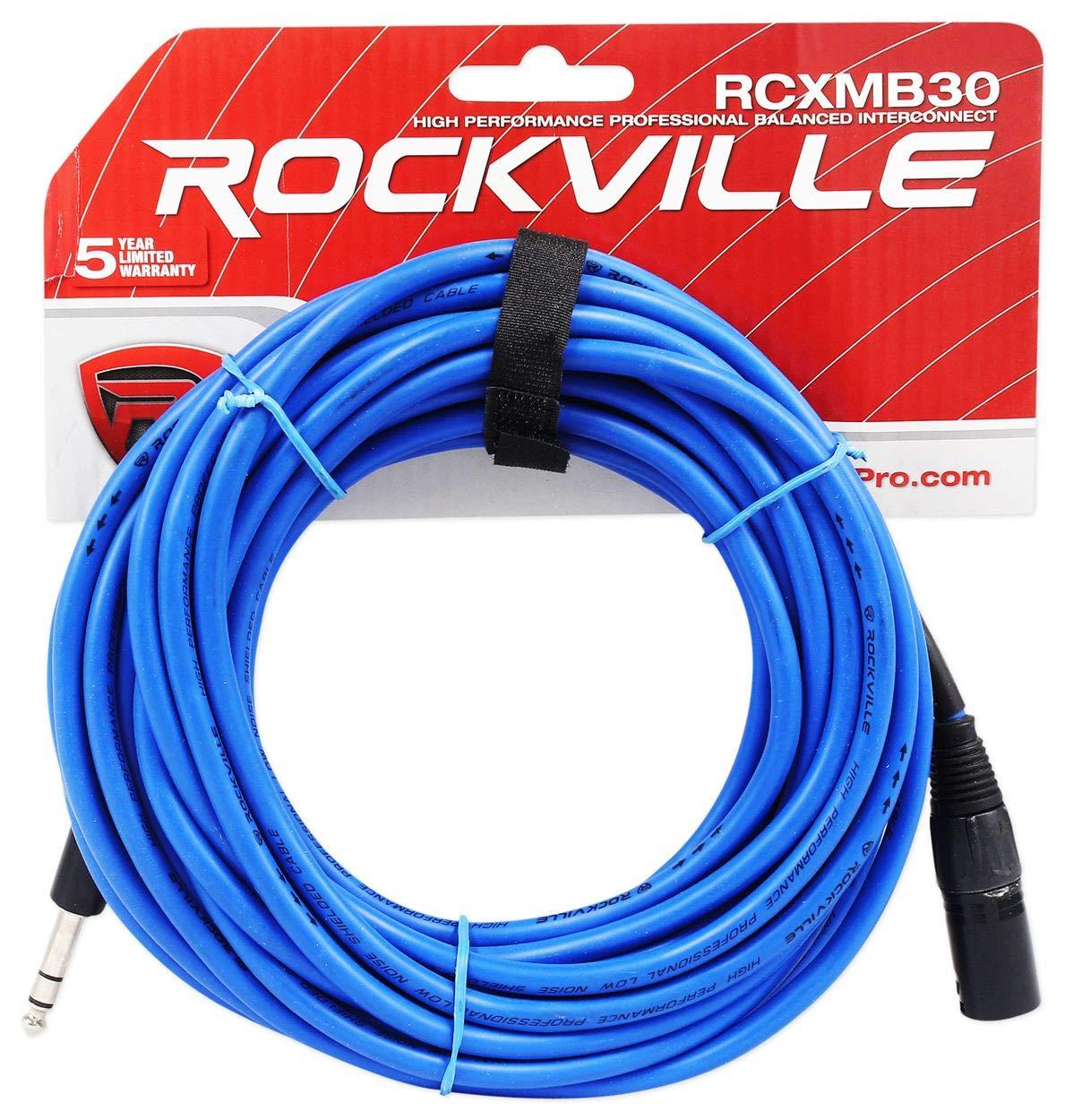 Rockville RCXMB30R 30ft Male XLR to 1/4” TRS Cable, 100% Copper, REAN Connectors, Durable PVC Jacket, Noise-Free, for Live Sound and Studio Recording(Blue)
