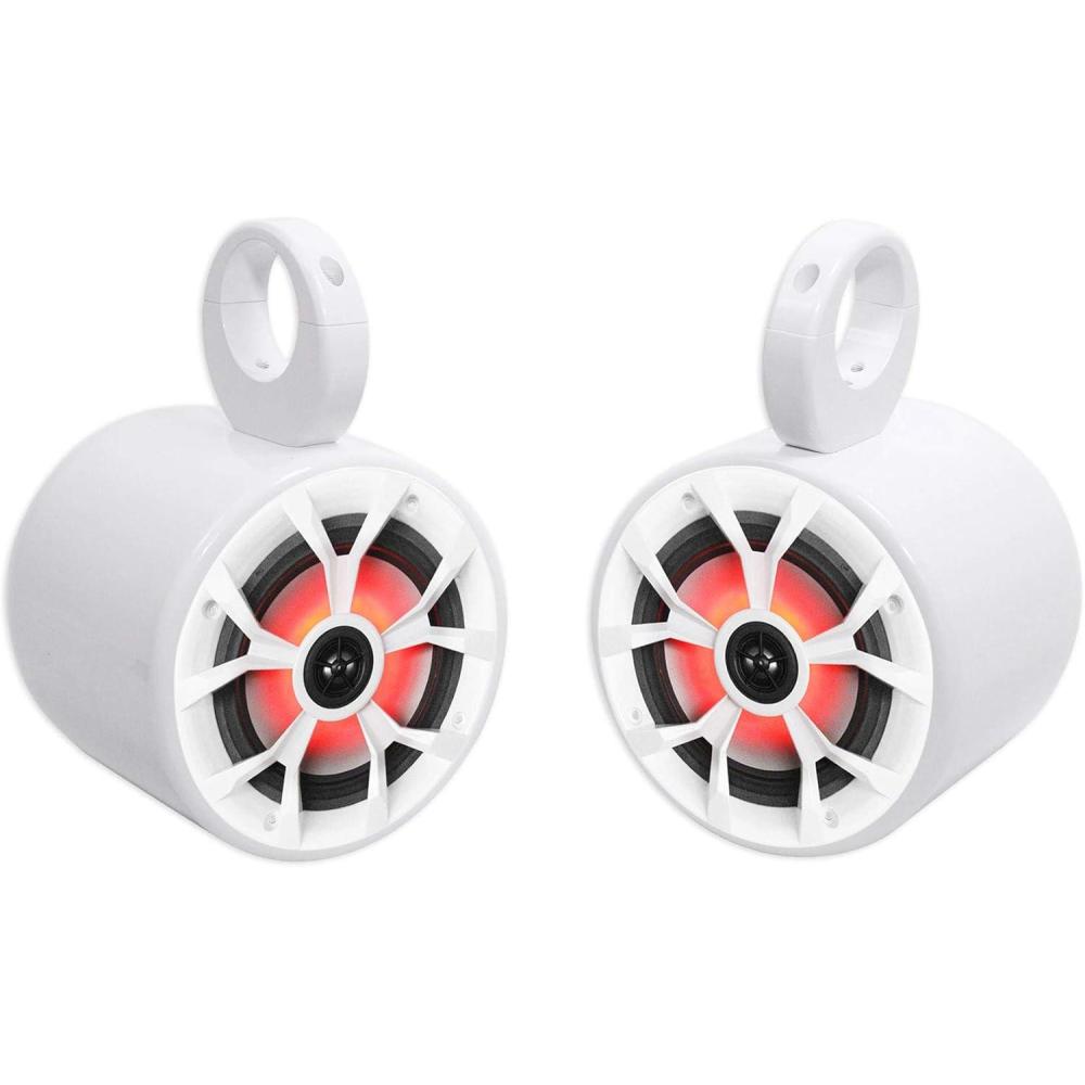 Package Includes: (1) Pair of Rockville RKL65MBW 6.5″ 700W Marine Boat Speakers w/LED, Black/White Grilles, (1) Pair of Rockville MAC65W 6.5″ White Aluminum Wakeboard Tower Speaker Pod Enclosures.