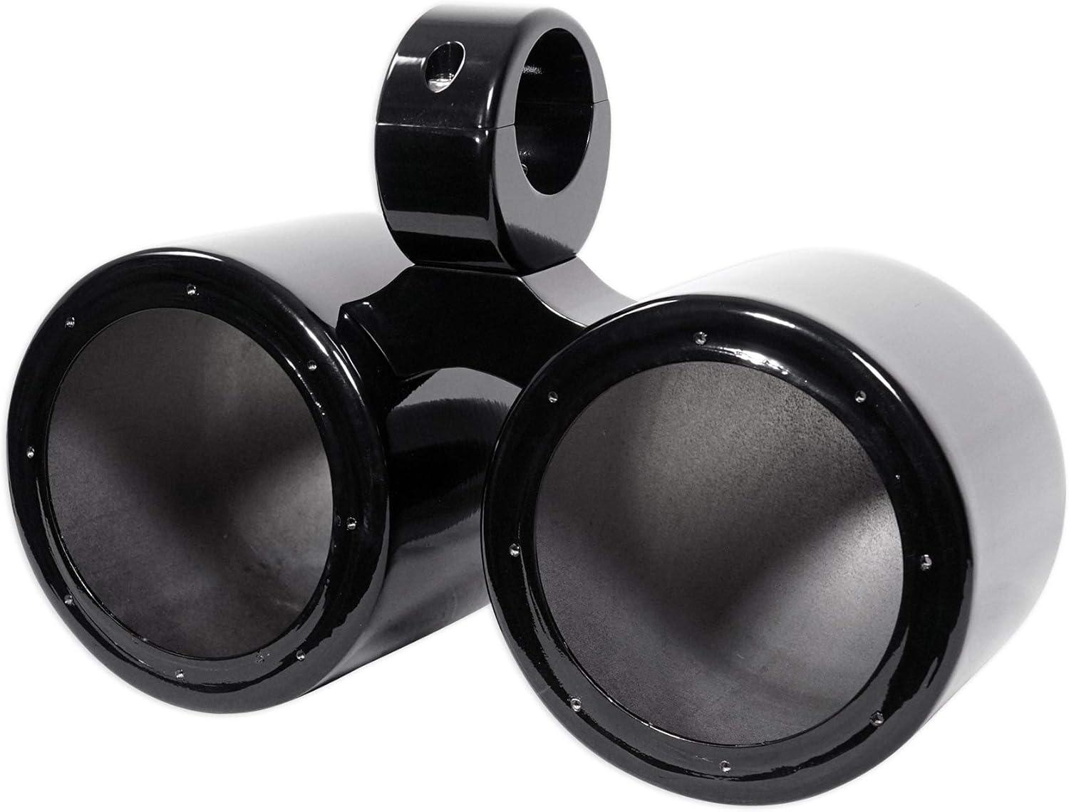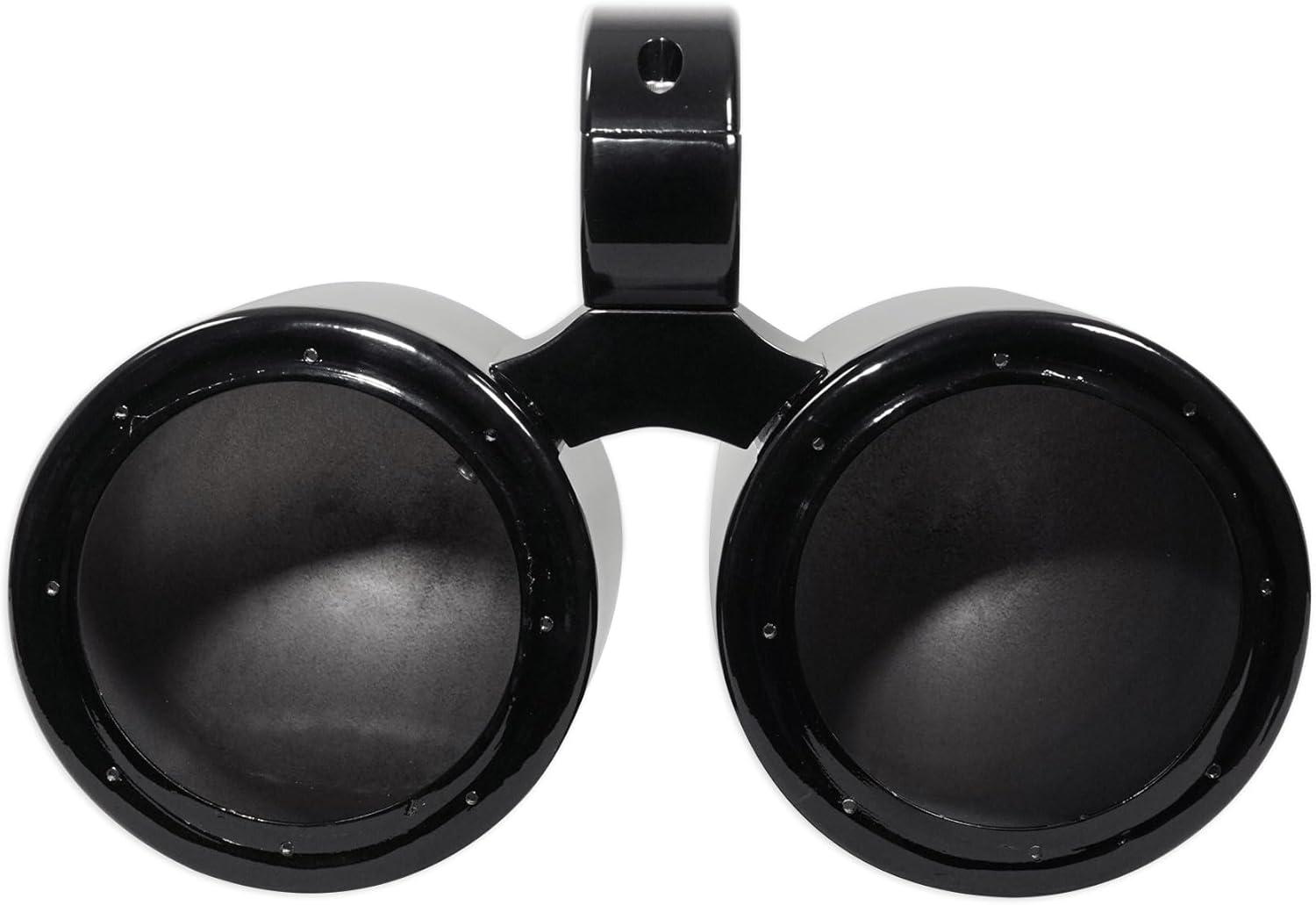 Wakeboard Tower Enclosure Build: Rockville DMAC65B dual 6.5″ wakeboard tower enclosures are constructed from aircraft-grade 6061 aluminum with a black powder-coat finish. The double pod design houses two speakers per enclosure and is fully marinized for salt and fresh water use. Internally wired construction keeps terminals protected inside the waterproof canister for a clean, secure installation. Key specs: mounting depth 7.4″; includes inserts/clamps for 2″-2.5″ tower tubes.