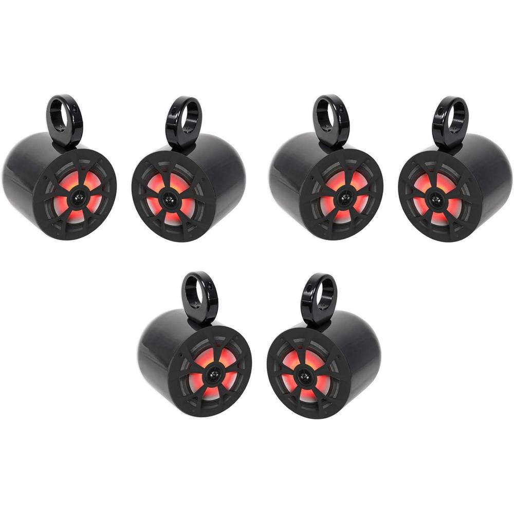Package Includes: (3) pairs of Rockville RKL65MBW 6.5″ 700-Watt marine boat speakers with LED lights and black/white grilles, plus (3) pairs of Rockville MAC65B 6.5″ black aluminum wakeboard tower speaker pod enclosures