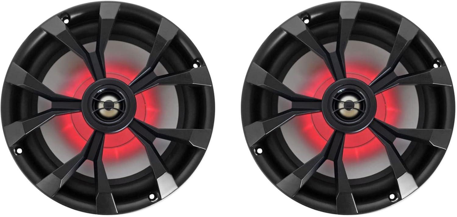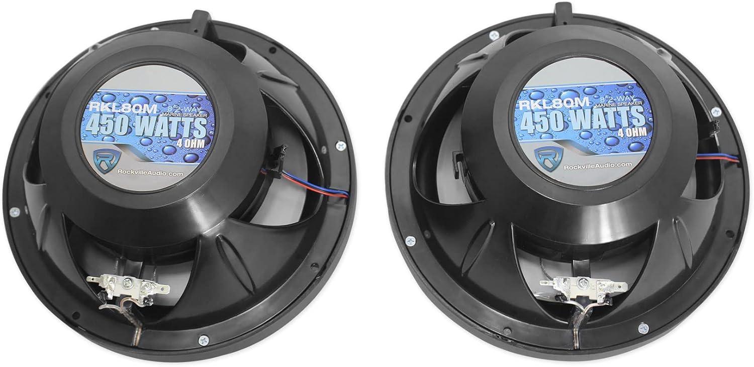 High-Power 8″ Marine Speakers with LEDs: Rockville RKL80MB pair delivers 450W peak / 200W RMS per speaker, beat-sync LEDs that flash to music (select red or blue), and IP66 waterproof protection. Features include UV-treated polypropylene cone, anti-corrosion stainless terminals, 1″ PEI tweeter, oversized 1.2″ CCAW Kapton voice coil, 22 oz Y30 magnet, 4-ohm impedance, 89 dB @ 1W/1m sensitivity and 40Hz-20kHz response, plus 8.07″ total diameter, 6.89″ cutout, 3.54″ mounting depth and 4.84″ height.