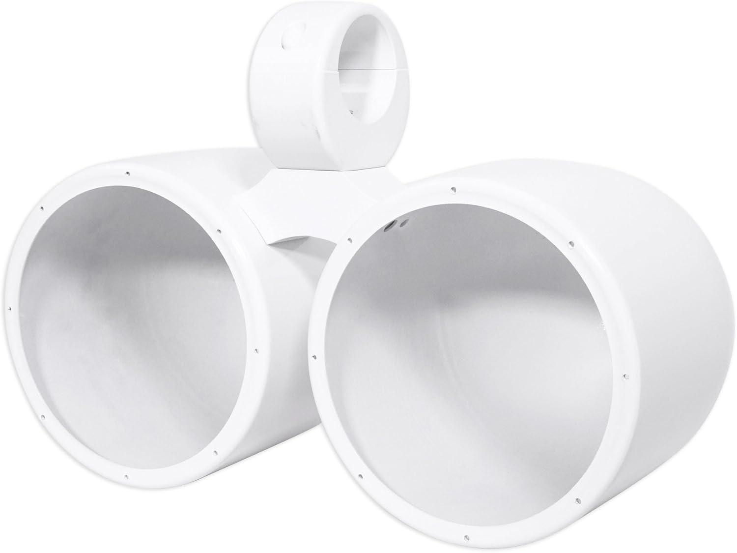 Rockville DMAC80W Wakeboard Tower Enclosures: Each DMAC80W dual tower pod is built from aircraft-grade 6061 aluminum with a white powder-coated finish for resistance to corrosion, chipping, and fading. Fully marinized, 100% waterproof, and internally wired to eliminate exposed terminals, these enclosures are designed to house two 7.7 in speakers and feature a 7.4 in mounting depth.
