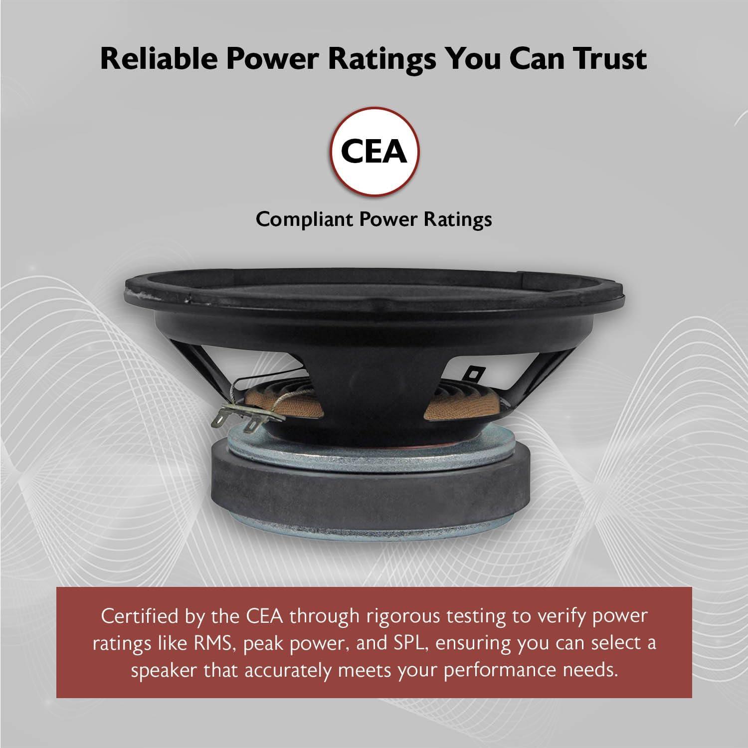 Keeping within the industry standard, these speakers are CEA compliant, which means they are tested and rated the same way that other premium brands such as Kicker, Rockford, and JBL rate their speakers. So you can feel confidant when comparing these with other midranges on the market or when matching these up with a high quality amplifier. This ensures Rockville products aren’t the subject of bogus claims or inflated specs. We have seen midranges labeled as 600 watts that really cannot even handle 100 watts. Our speakers are 100 times better sounding than the competition, and can handle way more power too.