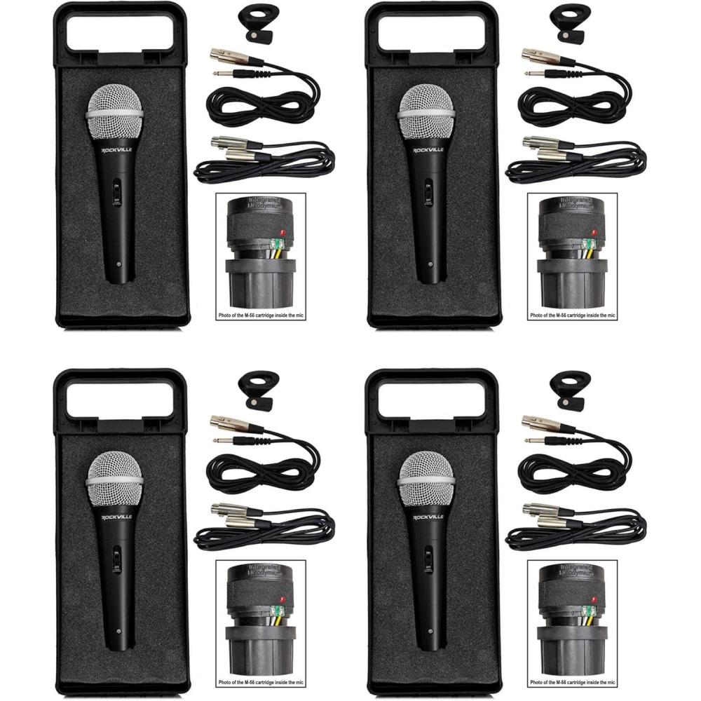 Package Includes: (4) Rockville RMC-XLR Wired Dynamic Handheld Microphones, (4) XLR to ¼” Cables, (4) XLR to XLR Cables, (4) Mic Clips, (4) Plastic Carry Cases