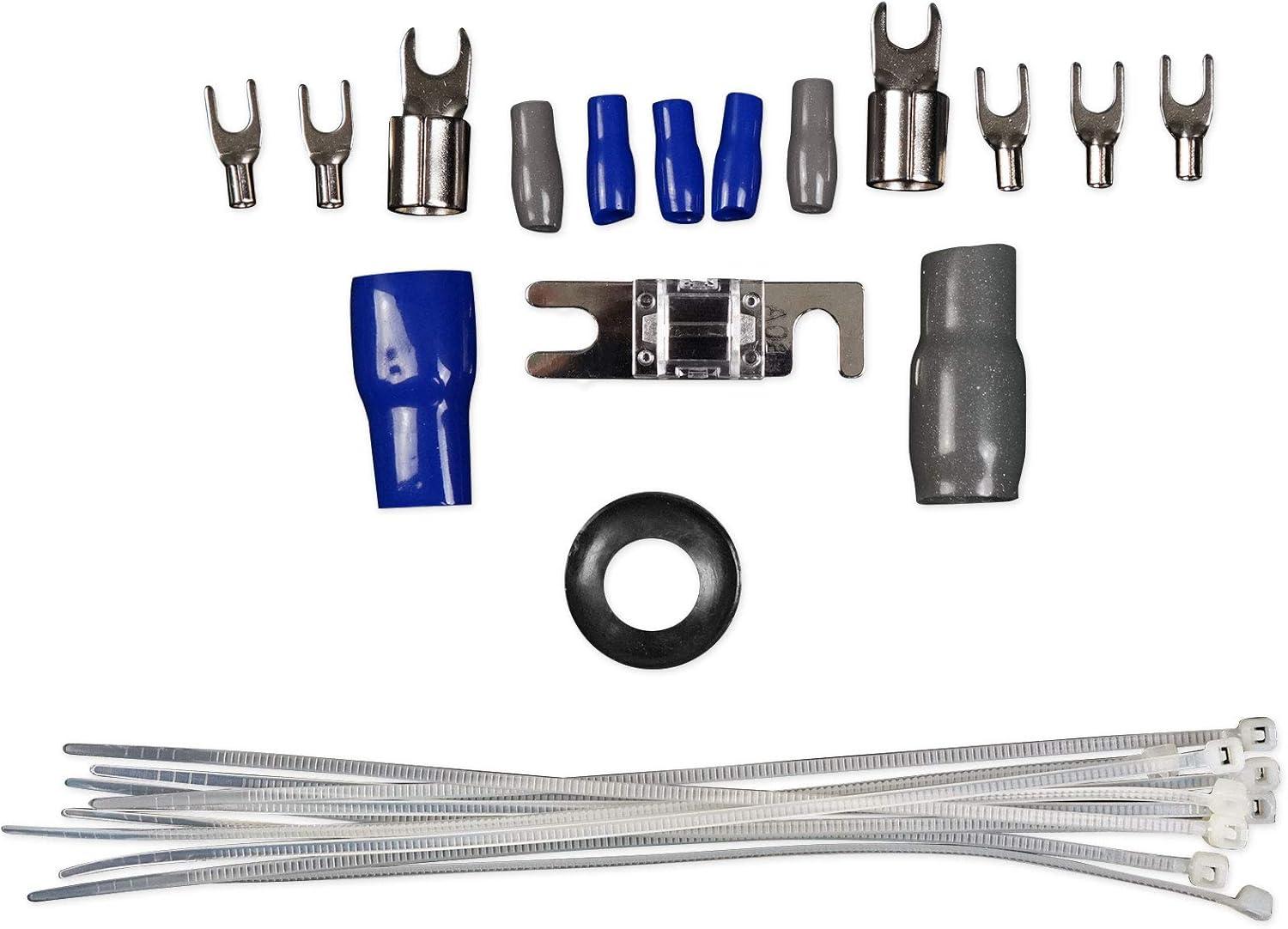 The kit is made to withstand harsh environments with waterproof insulation, corrosion-resistant materials, and a rugged fuse holder with included 120A and 80A Mini-ANL fuses. Also included are (2) ring terminals, (2) spade terminals, (5) speaker cable terminals, (10) white cable ties, and (1) washer for a secure, organized install.