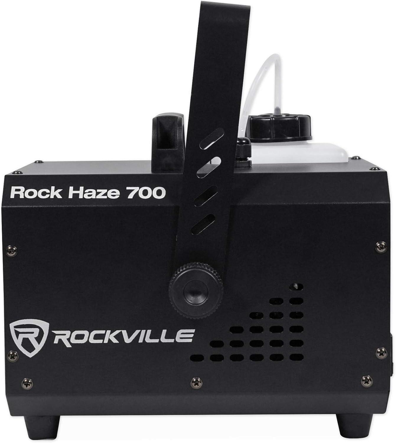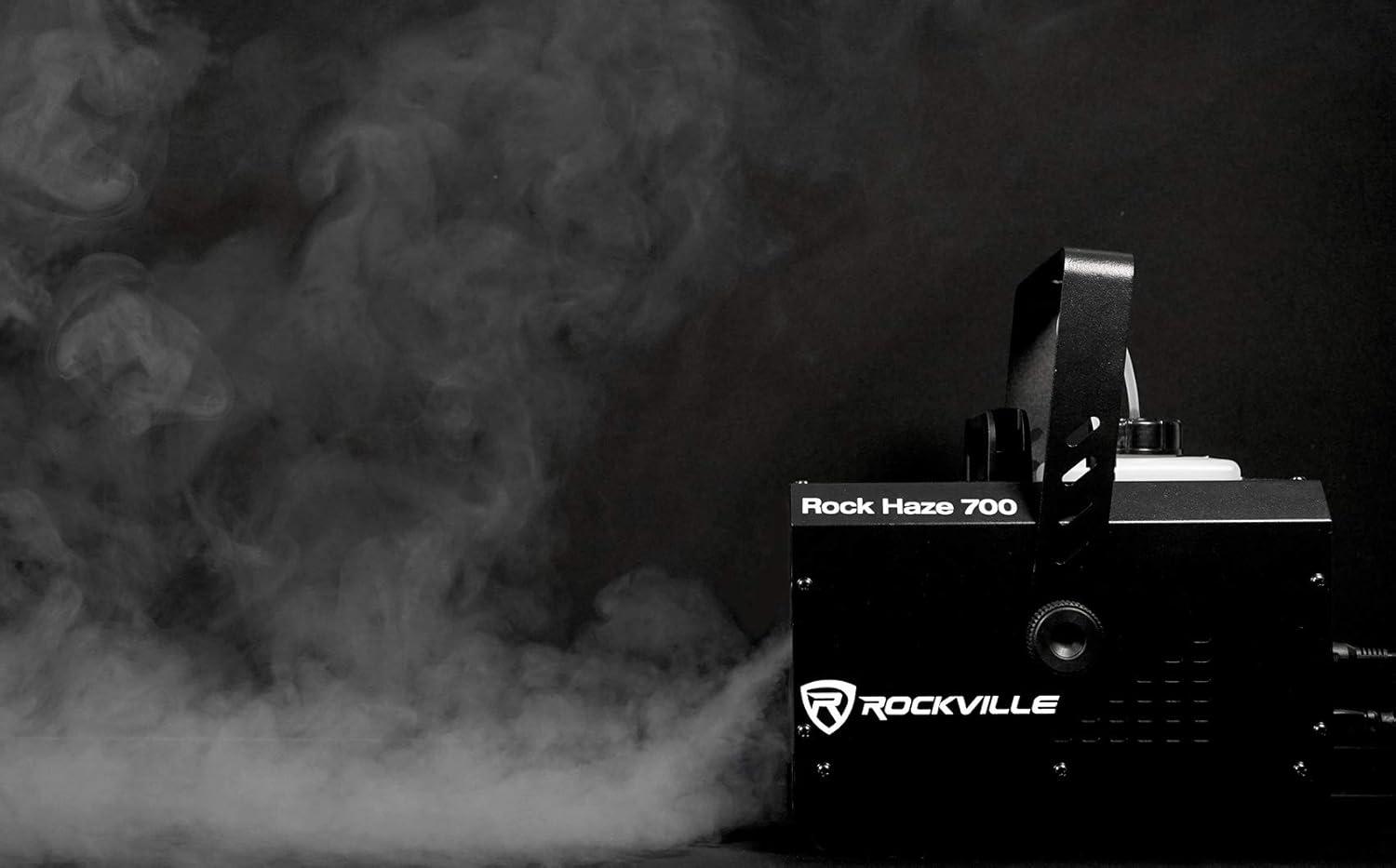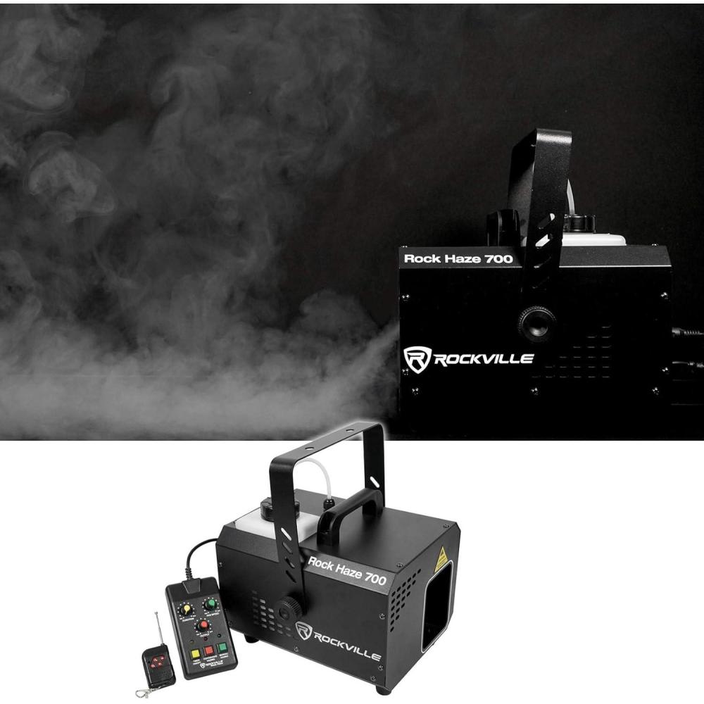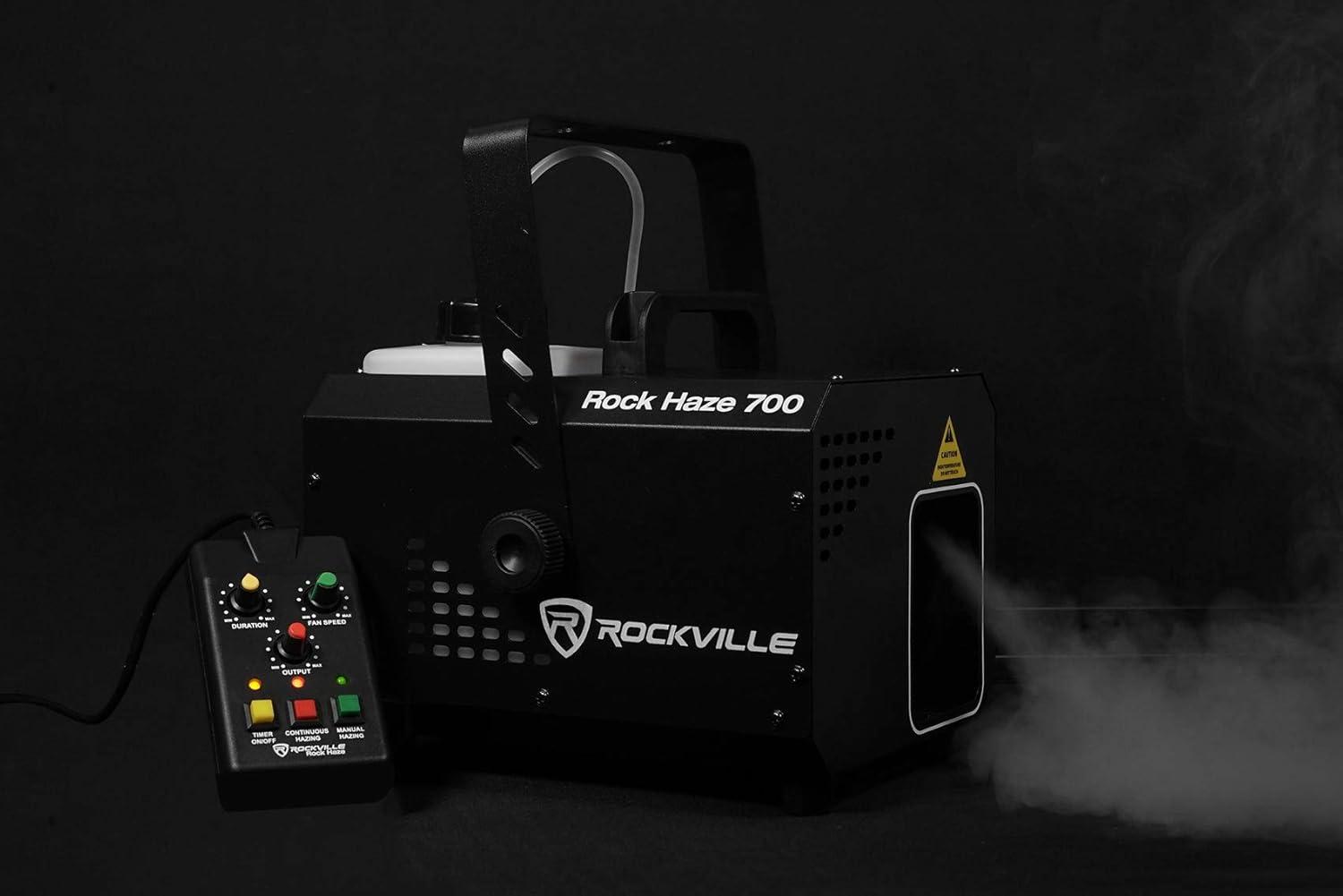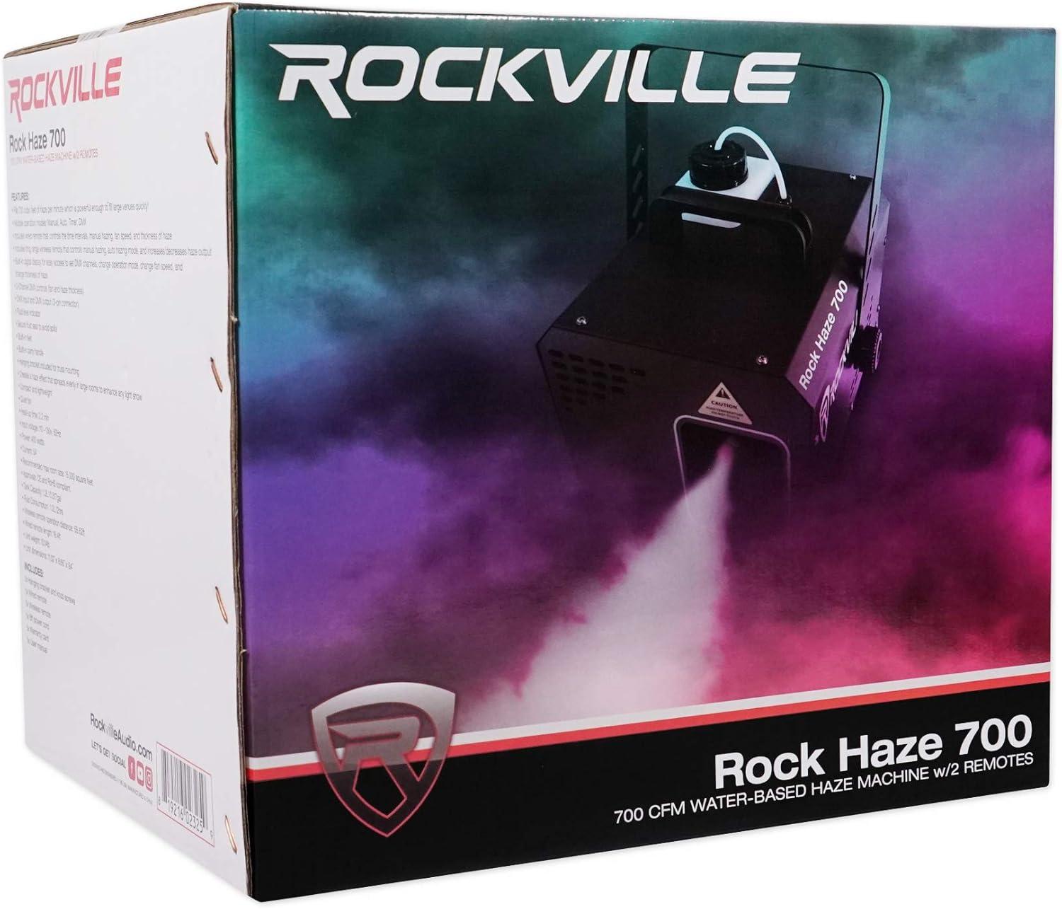 Rockville rockhaze 1, 000 CFM DMX haze machine water based DJ/Club hazer+(2) Remotes. This machine fills 1, 000 cubic feet of haze per minute which is powerful enough to fill large venues quickly!. Many operation modes: manual, auto, timer, DMX. Includes wired remote that controls the time intervals, manual hazing, fan speed, and thickness of haze. Includes long range wireless remote that controls manual hazing, auto hazing mode, and increases/decreases haze output. Built in digital display for easy access to set DMX channels, change operation mode, change fan Speed, and change thickness of haze. 2-Channel DMX controls (fan and haze thickness). DMX input and DMX output (3-pin connection). fluid level indicator. Secure fluid seal to avoid spills. Built in feet. Built in carry handle. Hanging bracket included for truss mounting. Creates a haze effect The spreads evenly in large rooms to enhance any light show. Compact and lightweight. Quiet fan. Heat-up time: 2.2 min. Input voltage: 110 – 130V, 60 Hz. Power: 800 watts. Current: 10A. Recommended Max room size: 20, 000 square feet. Approvals: CE and RoHS compliant. Tank capacity: 1.2L/ 0.317gal. Fluid consumption: 1.2L/2hrs. Wireless remote operation distance: 65.62ft. Wired remote length: 16.4ft. Unit weight: 11.023lb. Unit dimensions: 12.28” x 8.66” x 10.63”. Shipping weight: 14.33lb.