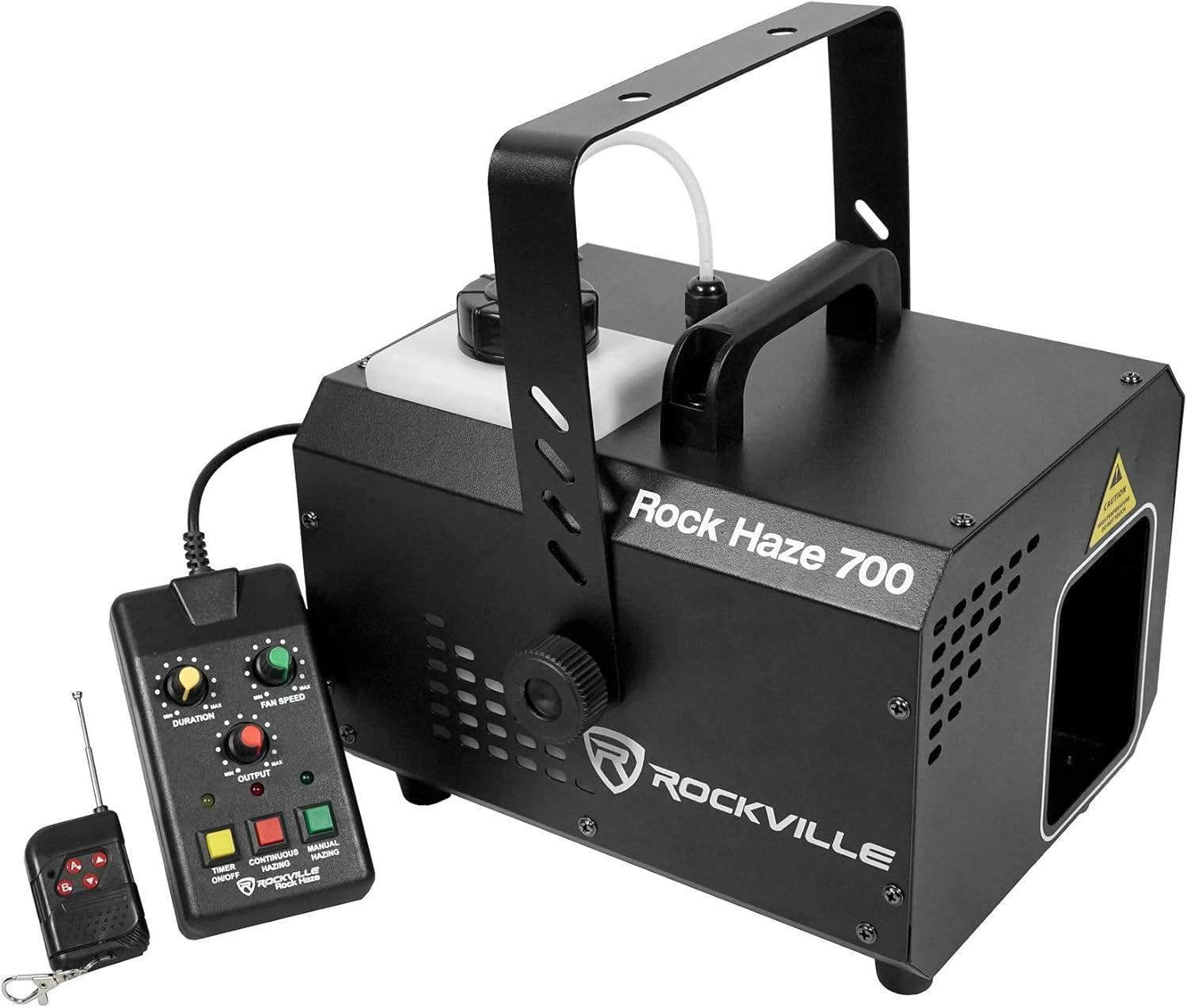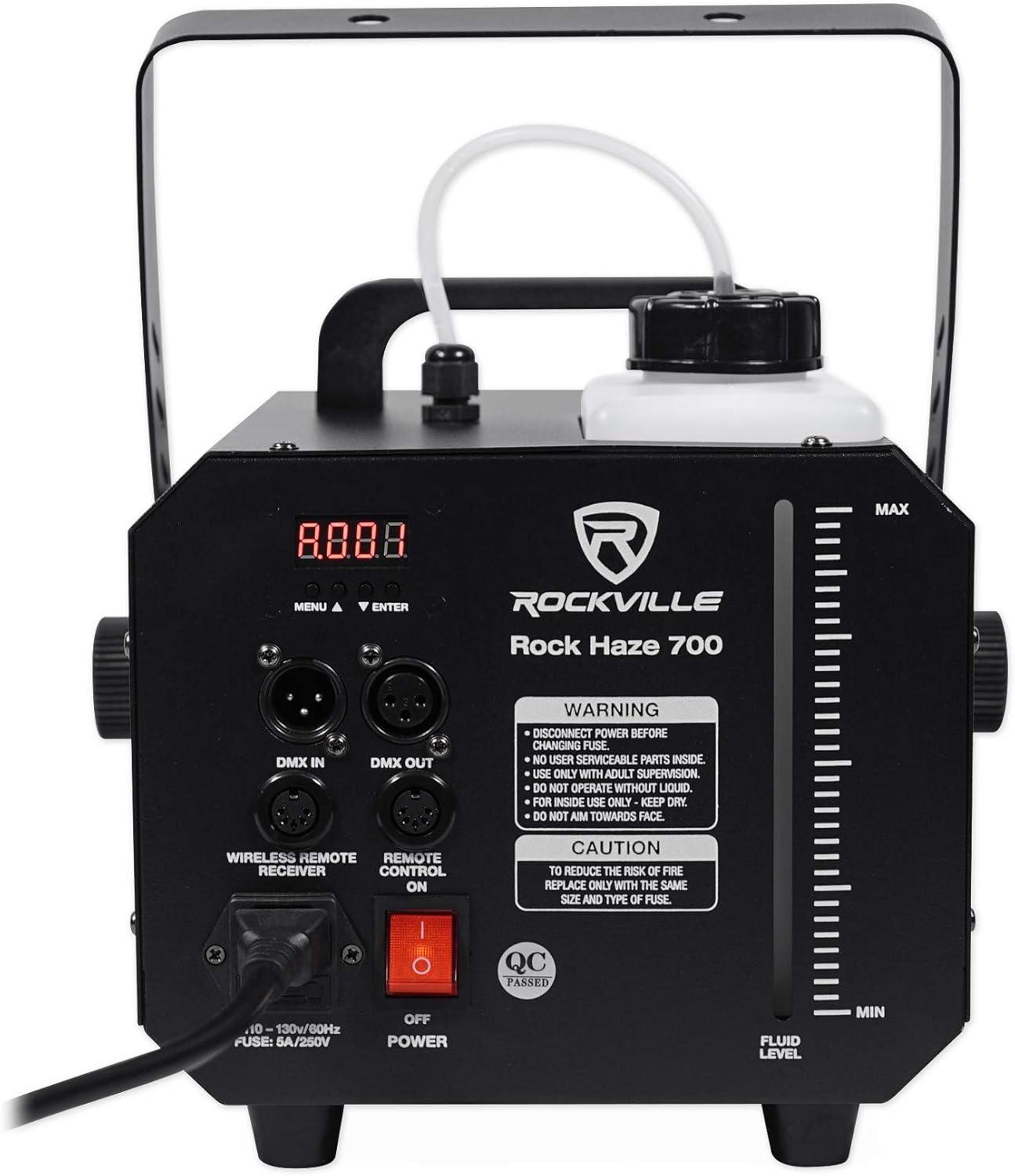 Rockville rockhaze 1, 000 CFM DMX haze machine water based DJ/Club hazer+(2) remotes. This machine fills 1, 000 cubic feet of haze per minute which is powerful enough to fill large venues quickly!. Many operation modes: manual, auto, timer, DMX. Includes wired remote that controls the time intervals, manual Hazing, fan speed, and thickness of haze