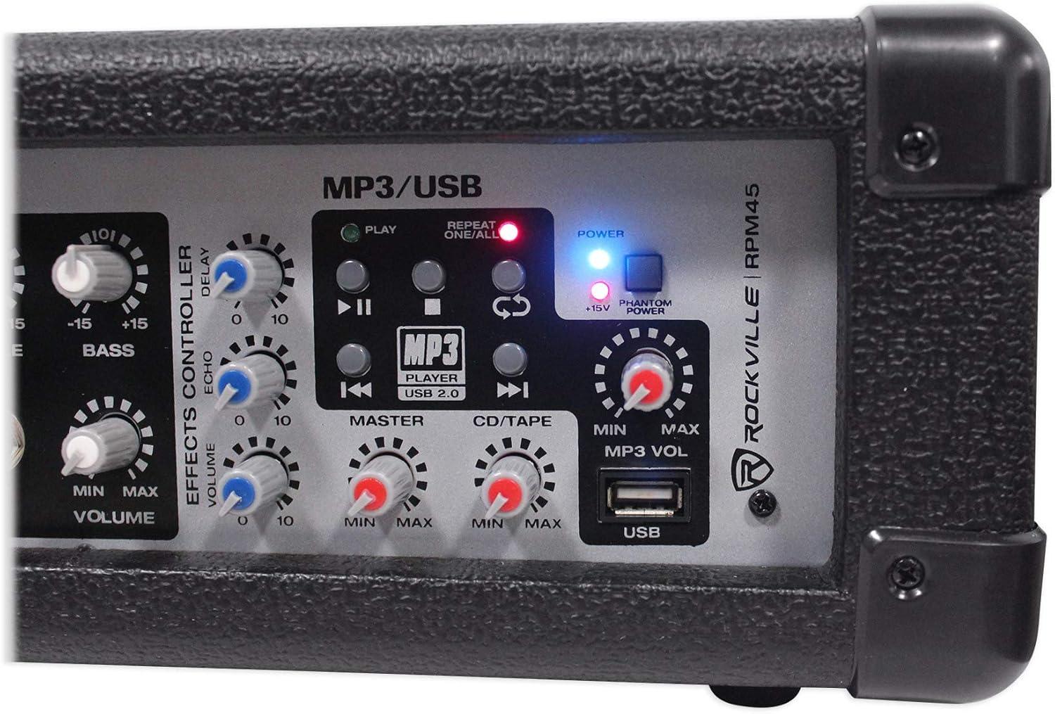 The Rockville RPM45 1800w Powered 4-Channel Mixer Amplifier is built for musicians, DJs, and event organizers who need powerful, versatile sound in a compact package. With 1800w peak power (225w x 2 RMS @ 8 Ohm), it delivers clear, professional audio for live performances, karaoke, presentations, and small to medium venues such as churches, schools, or bars. Its rugged wooden enclosure offers lasting durability, while the lightweight 18 lbs design ensures portability.
