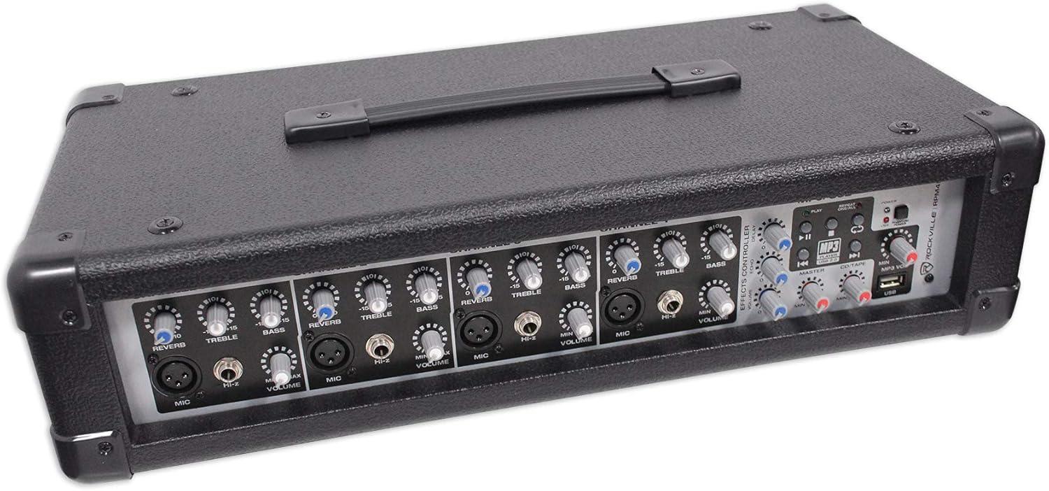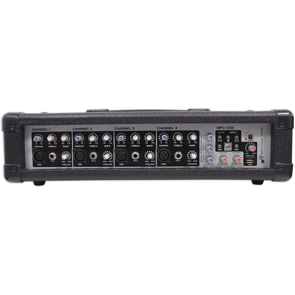 Features: Rockville RPM45 1800w Powered 4 Channel Mixer with USB, Effects, Phantom.