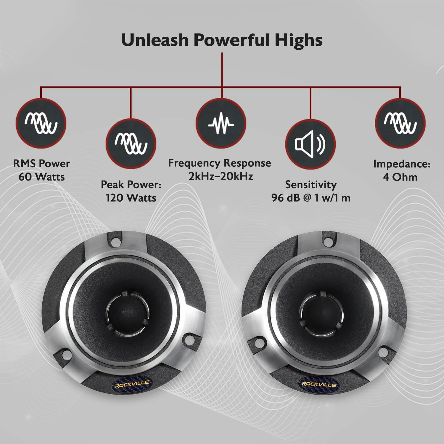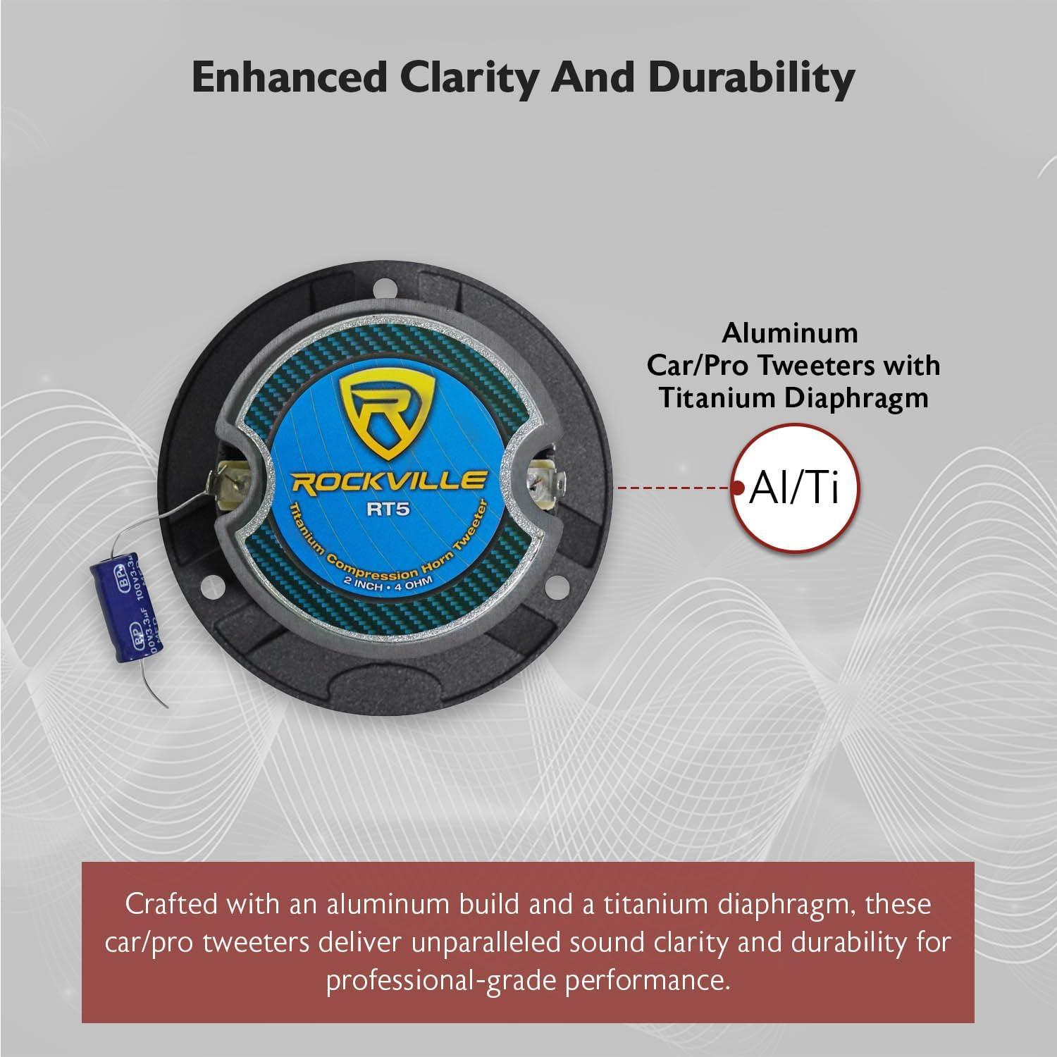 High-Performance Tweeters: Rockville RT5 pair delivers 120W peak power (60W RMS) with a titanium diaphragm for clear and precise highs.