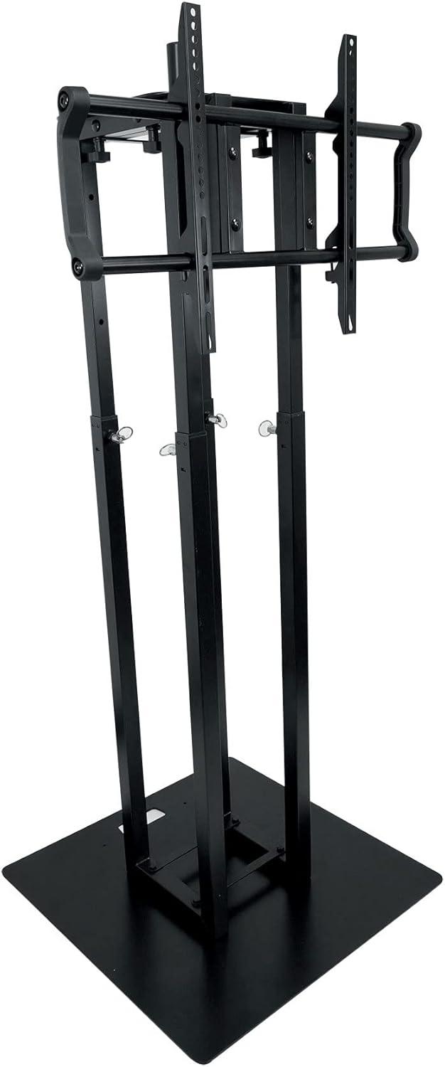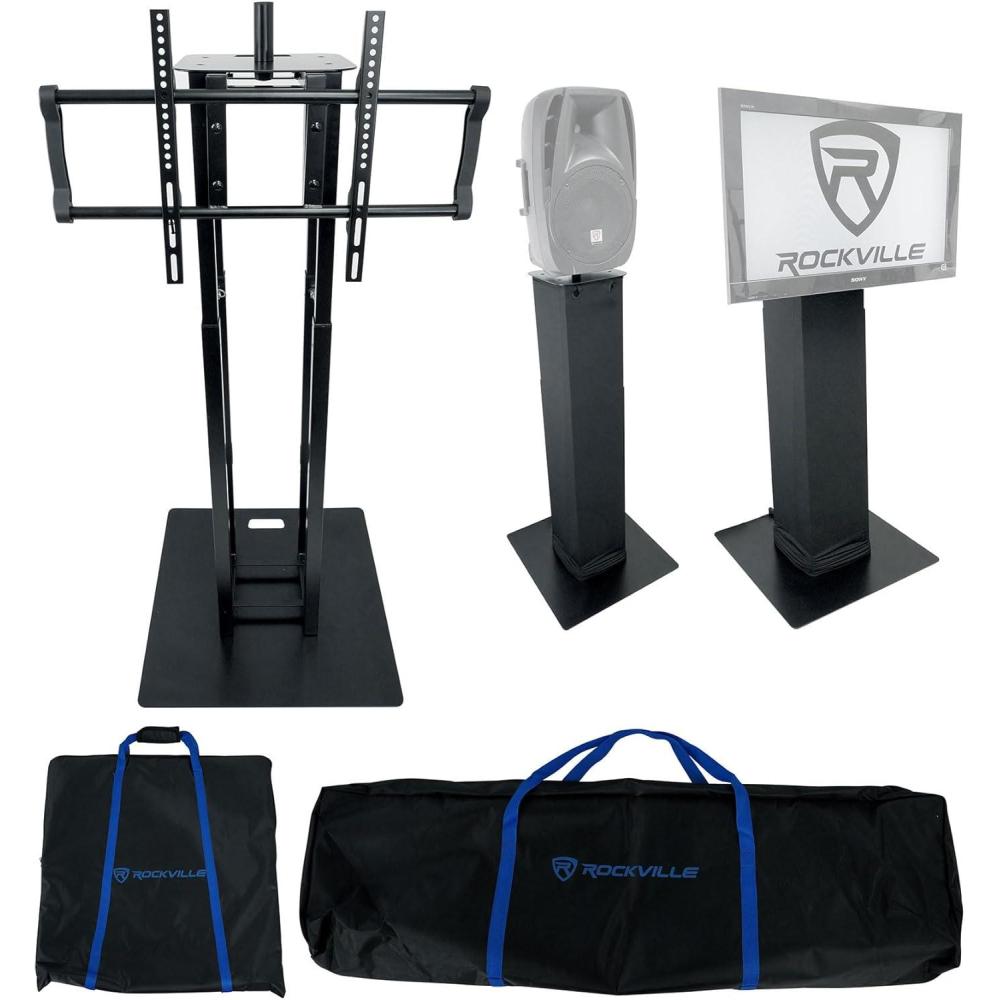 What's In The Box: (1) Podium Stand. (1) TV bracket. (1) White Scrim. (1) Black Scrim. (1) Bag for Main Frame Base, and Top Support Legs. (1) Bag for Top Plate and Base Plate. (1) 35mm Short Pole Mount Adaptor. (1) 35mm Long Pole Mount Adaptor. Non-slip foam EVA pads. (1) 8mm Thumb Bolt and Washer Pack. Warranty Card. Owner's Manual. Features: Rockville RTP33-TV Totem Stand With TV Mount. Supports TV's from 30 inches to 70 inches. TV bracket is detachable so you can use the totem on its own or with the TV attachment. Quick assembly and break-down (around 10-12 minutes). Extra large and thick steel base is extremely stable. To support the TV securely we made the base plate double the size of our regular Totem stand model. Perfect for lights, speakers, monitors, etc.. Adjustable height from 39″ inches to 69″ inches. Designed for maximum stability even at its top height of 69″ inches. Includes 2 sets of scrims (black and white). Includes 2 travel bags for easy transporting. Includes 2 35mm pole mount speaker adapters for mounting speakers. Non-slip foam EVA pads can be attached to the top plate. Velcro cable ties included for neat cable management. Unique, spring loaded turn and lock mechanism for easy height adjustment. Base and top plate have integrated transport handles. Includes frame support bars to assist with stability. Includes 8mm quick release thumb screws and bolts for easy assembly. Color: Black. Steel Construction. Base plate (W x D x H): 24.6″ x 24.6″ x 0.19″ inches. Top plate (W x D x H): 11.8″ x 11.8″ x 0.11″ inches. Short Pole mount speaker adapter Length: 3.54″. Long Pole mount speaker adapter Length: 7.08″. Unit dimensions for transport (W x D x H): 41.34″ x 29.53″ x 8.27″ inches. Maximum weight that the unit will support: 220 lbs.. Max weight the TV bracket can support is 66 lbs.. Unit Weight: 64 Lbs. (including the TV stand)