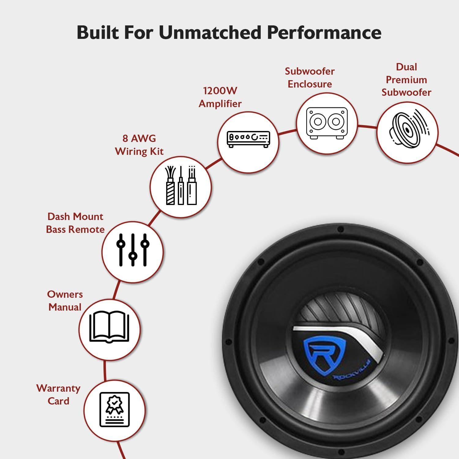 Rockville RV10.2B 1000W Peak/350W RMS Dual 10" Car Subwoofer Enclosure, Class A/B Mono Amplifier, Ported Vented Design, Dash Mount Bass Remote, Amp Kit, for Deep Bass Car Audio