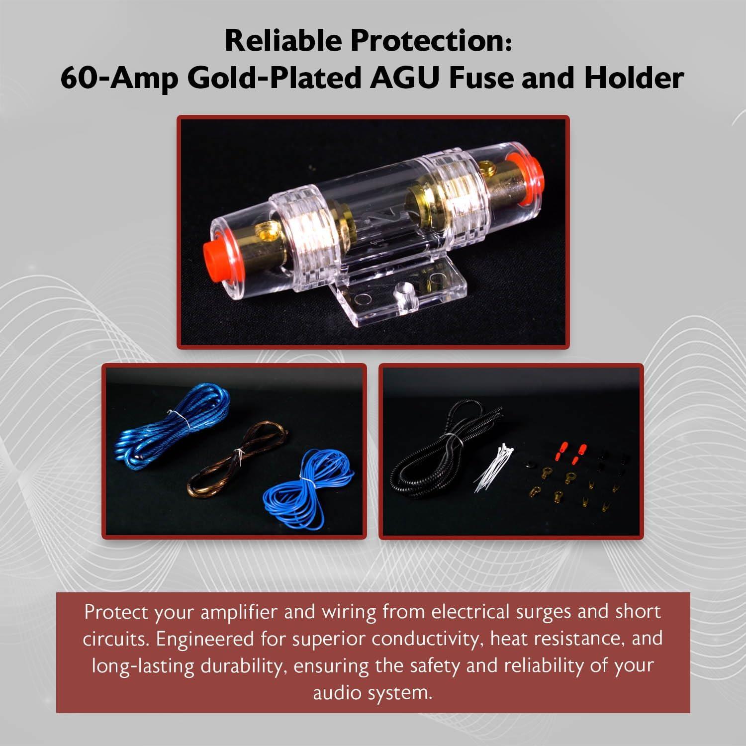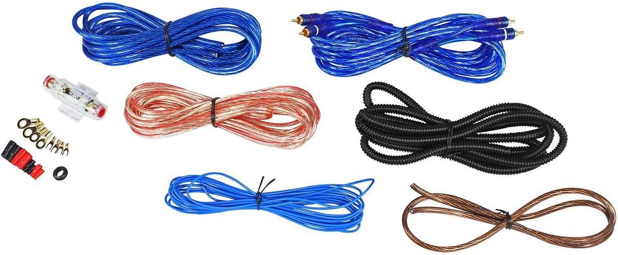 FULL WIRING KIT INCLUDED: 8 AWG kit with 100% copper twisted pair RCA cables, gold-plated ANL fuse holder, power/ground wires, speaker wire, and installation accessories.