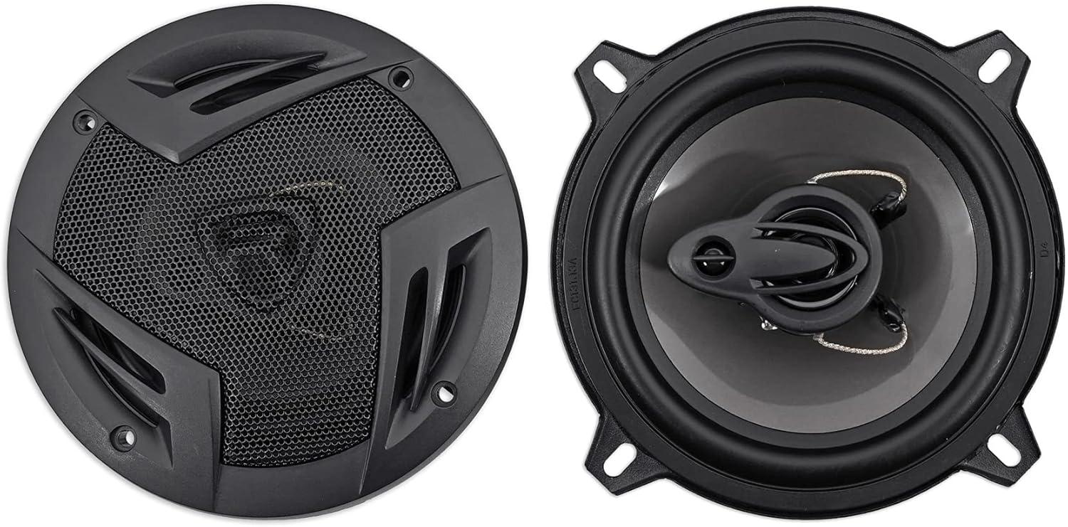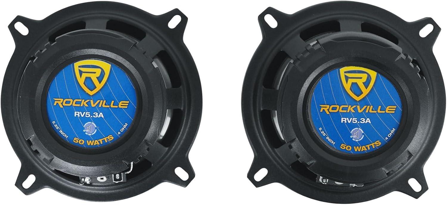 RV5.3A Speaker Performance: Rockville RV5.3A 5.25″ 3-way speakers are CEA compliant at 600 Watts per Pair / 300 Watts Each peak and 100 Watts per Pair / 50 Watts Each RMS. Built with a polypropylene woofer, Flex Motion Butyl Rubber Surround, 1.2″ PEI dome tweeter plus 0.6″ super tweeter, and steel basket. Specs: 55-20,000 Hz, 90 dB @ 1w/1m, 4 Ohm; grilles included; cutout 4.52″, 1.89″ top depth, 2.1″ bottom depth.