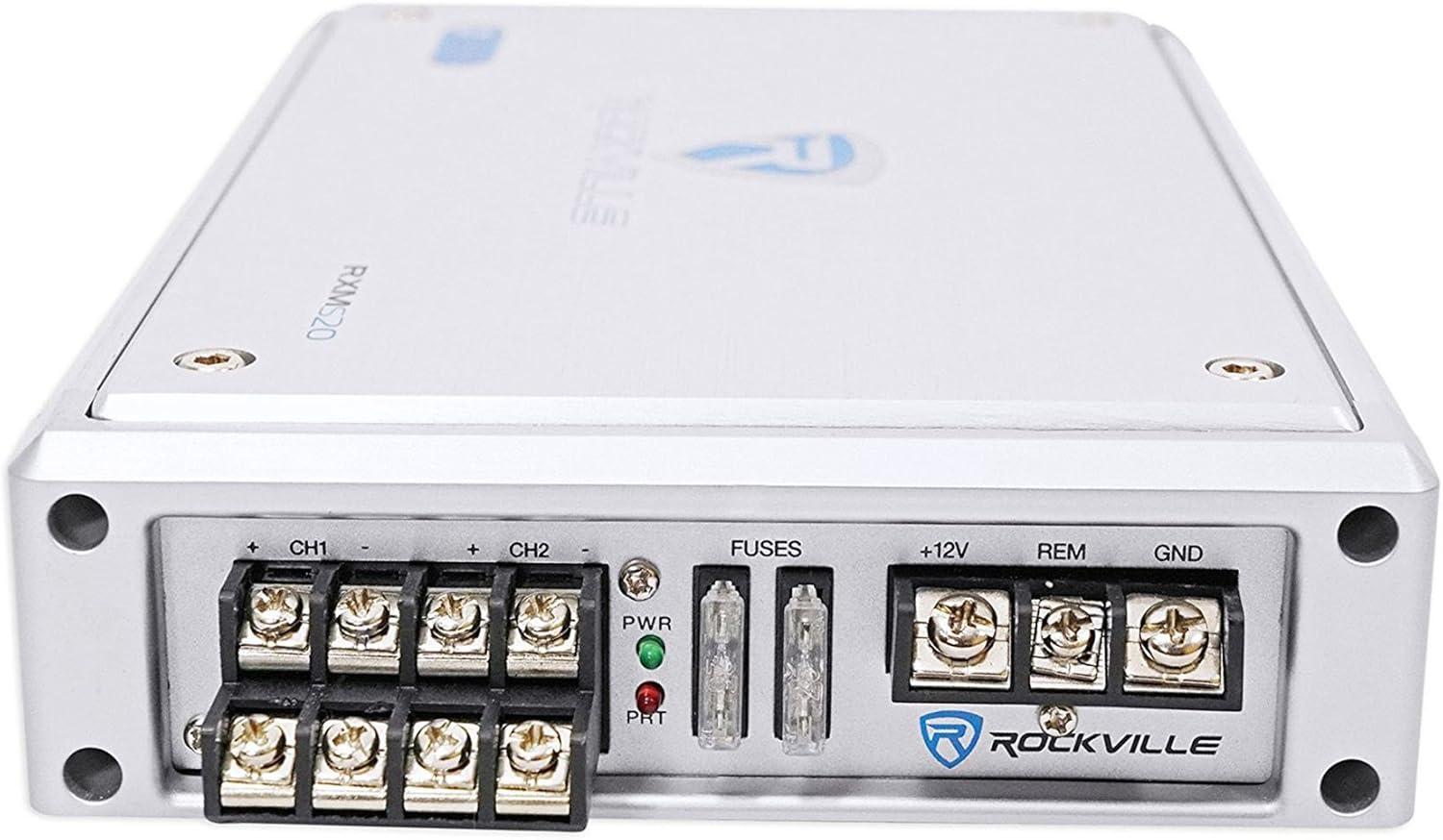 Amplifier Control & Expansion: Package includes a Rockville RXM-S6 Marine/Boat 6 Channel Amplifier rated 2600 Watt Peak / 660w Dyno-Certified RMS with Status Mode LED Indicator, and the listing also details Rockville RXM-S20 Proton Series specs including 1,600 Watts peak, 300 Watts Dyno Certified RMS (4 x 75 @ 4 Ohms), 400 Watts (4 x 100) @ 2 ohms, and 400 Watts (2 x 200) bridged @ 4 Ohms, plus PA microphone talkover.
