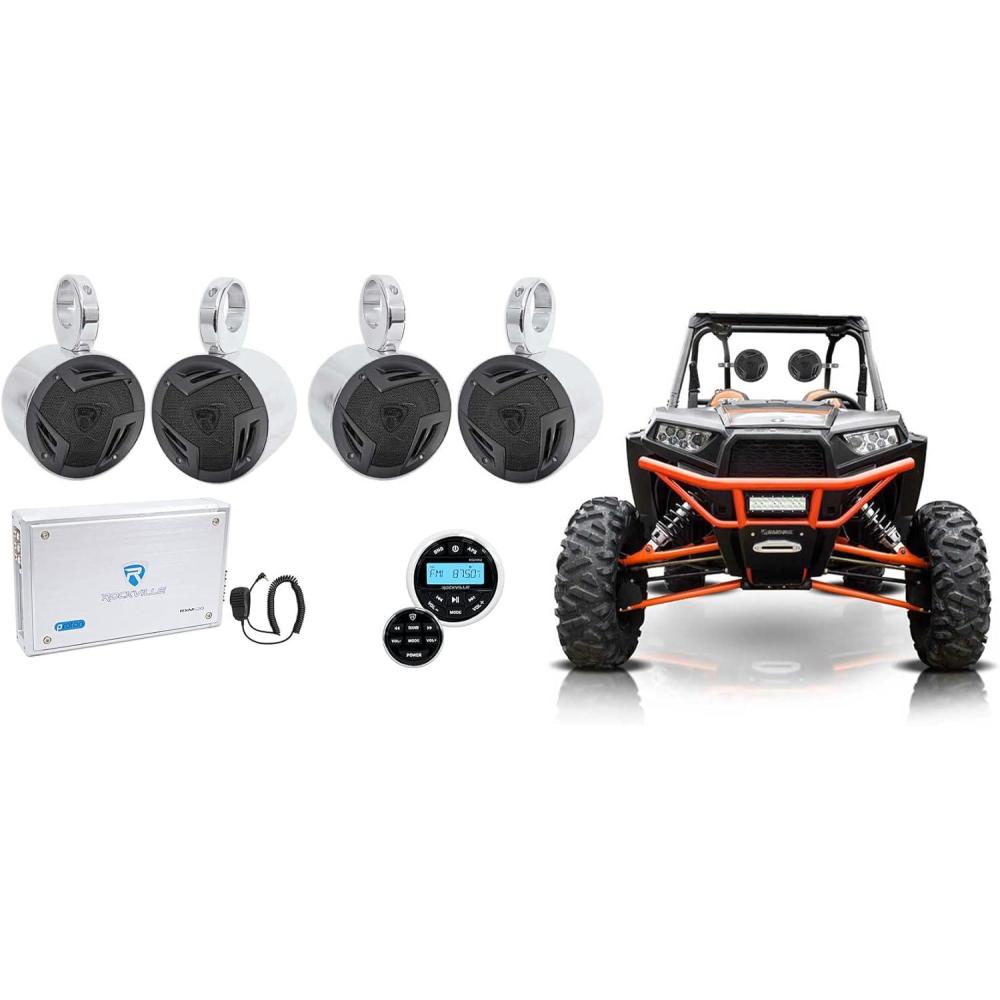 Package Includes: (2) Pairs of Rockville RV5.3A 5.25″ 3-Way Car Speakers 1200 Watts/200 Watts RMS CEA Rated; (2) Pairs of Rockville MAC525S 5.25″ Polished Metal Marine Wakeboard Speaker Pod Enclosures; (1) Rockville RGHR2 Marine Gauge Hole Receiver w Bluetooth USB, Radio + Wired Remote; (1) Rockville RXM-S6 Marine/Boat 6 Channel Amplifier 2600 Watt Peak / 660w Dyno-Certified RMS With Status Mode LED Indicator