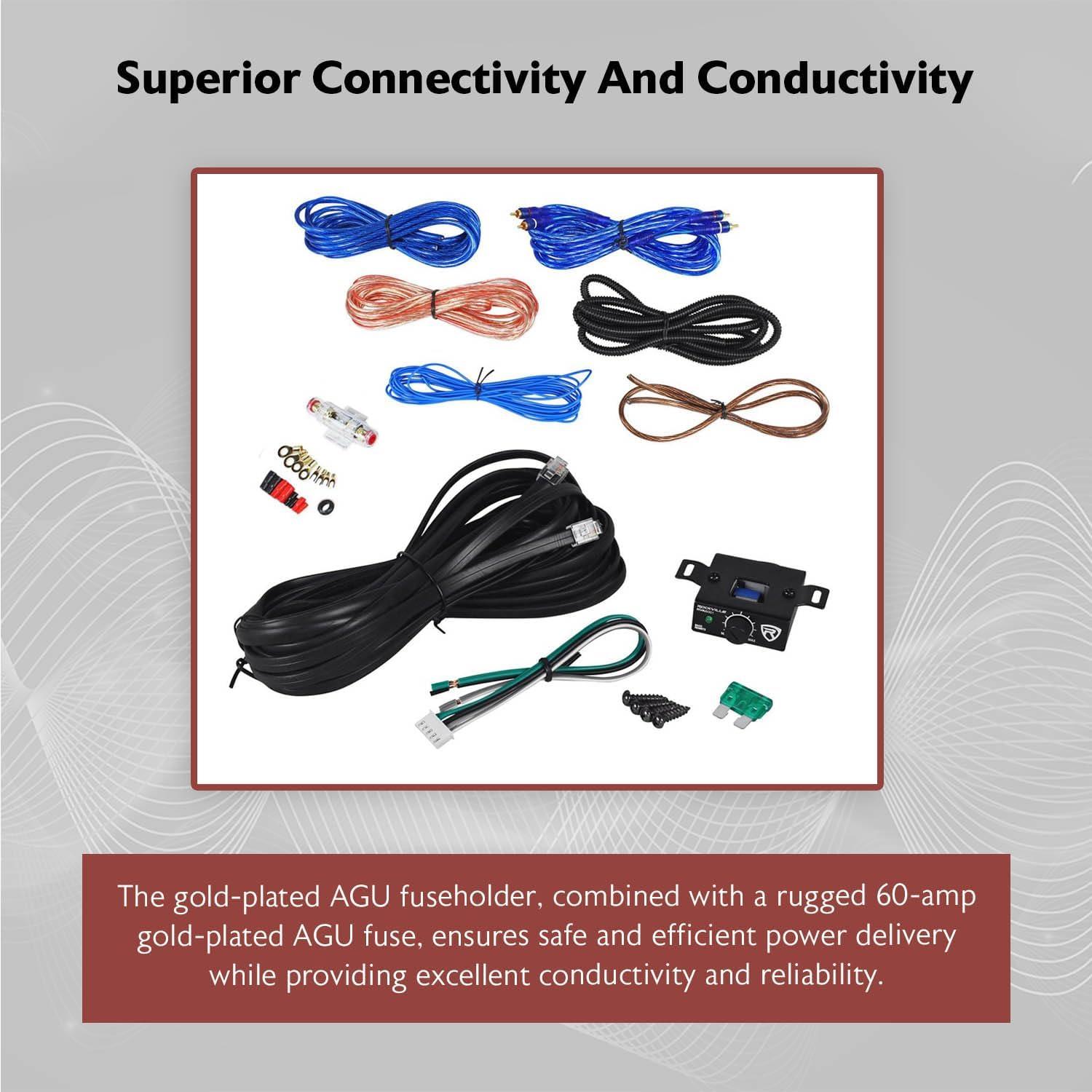 The included 8 AWG wiring kit features 100% copper RCA cables, power and ground wires, speaker wire, remote cable, fuse holder, and accessories-everything needed for a straightforward installation.