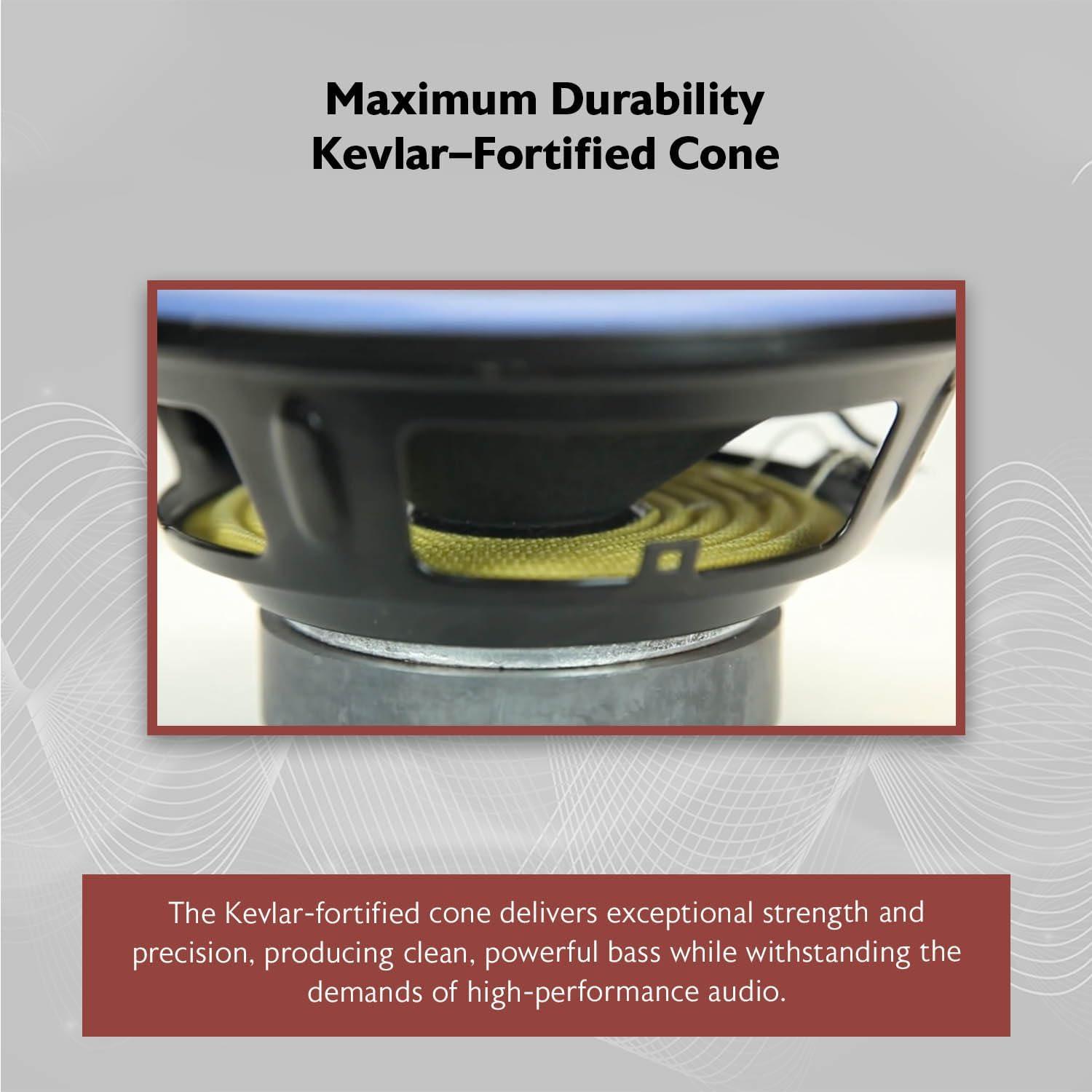 DURABLE CONSTRUCTION: Built with an anti-vibration MDF cabinet and Kevlar-reinforced cone, ensuring reliable performance and clear sound quality.