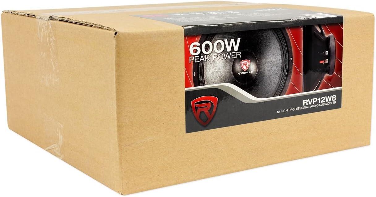 Features: Rockville RVP12W8 12″ 600 Watt Raw Replacement Subwoofer. Power Rating :. Power RMS : 600 Watts (300 Watts per Subwoofer). Peak Power : 1200 Watts (600 Watts per Subwoofer). Fiber Reinforced Ultra Stiff Paper Composite Cone. Paper Composite Dust Cap. Expanded and Rolled Steel Basket. Accordion Cloth Surround. Ultra Saturated, High BL Magnetic Motor Gap. 2″ High Temperature CCAW High SPL Voice Coil.