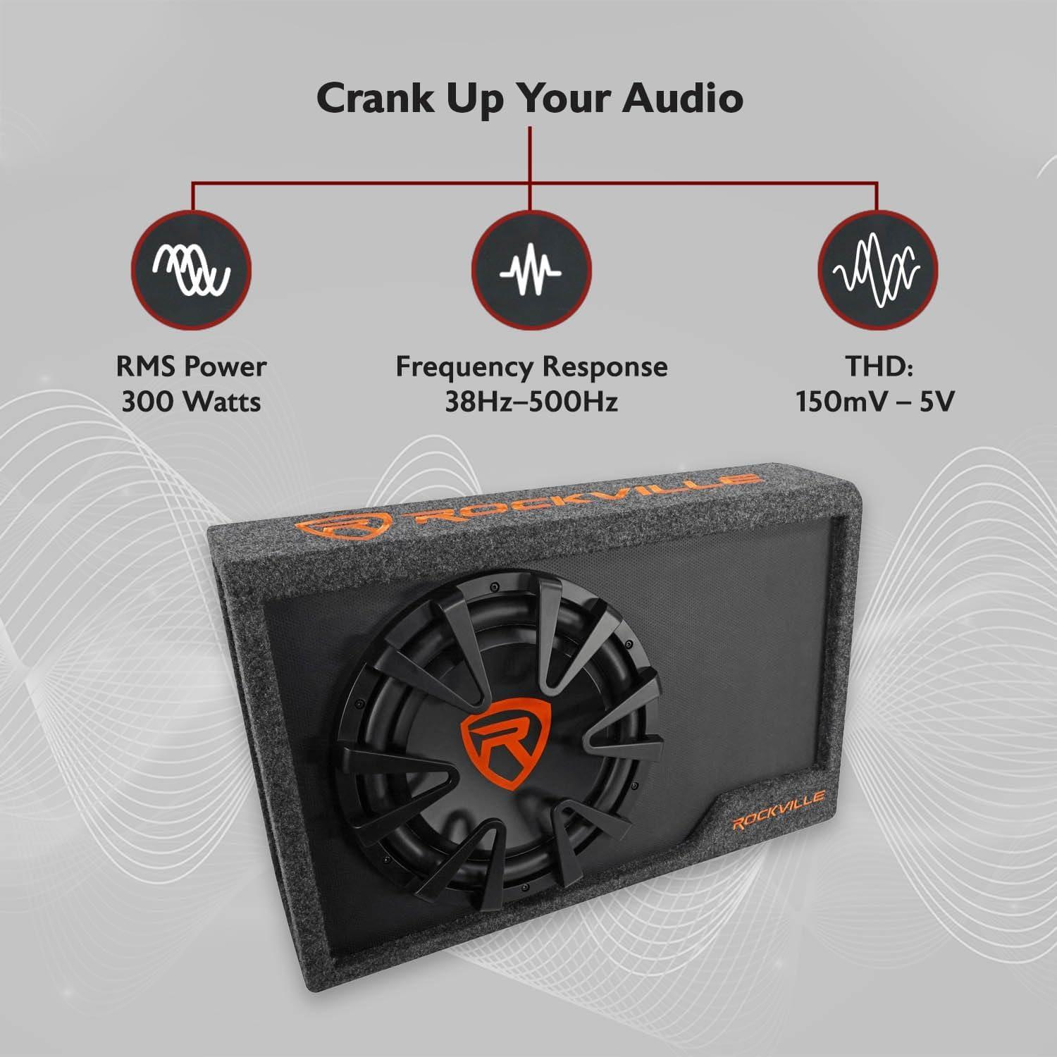 The Rockville RWS12CA 1200W 12″ Amplified Powered Car Subwoofer Enclosure delivers hard-hitting bass in a slim, space-saving design. Perfect for cars, trucks, and SUVs, this all-in-one system combines a subwoofer, enclosure, and amplifier to simplify installation while maximizing sound quality.