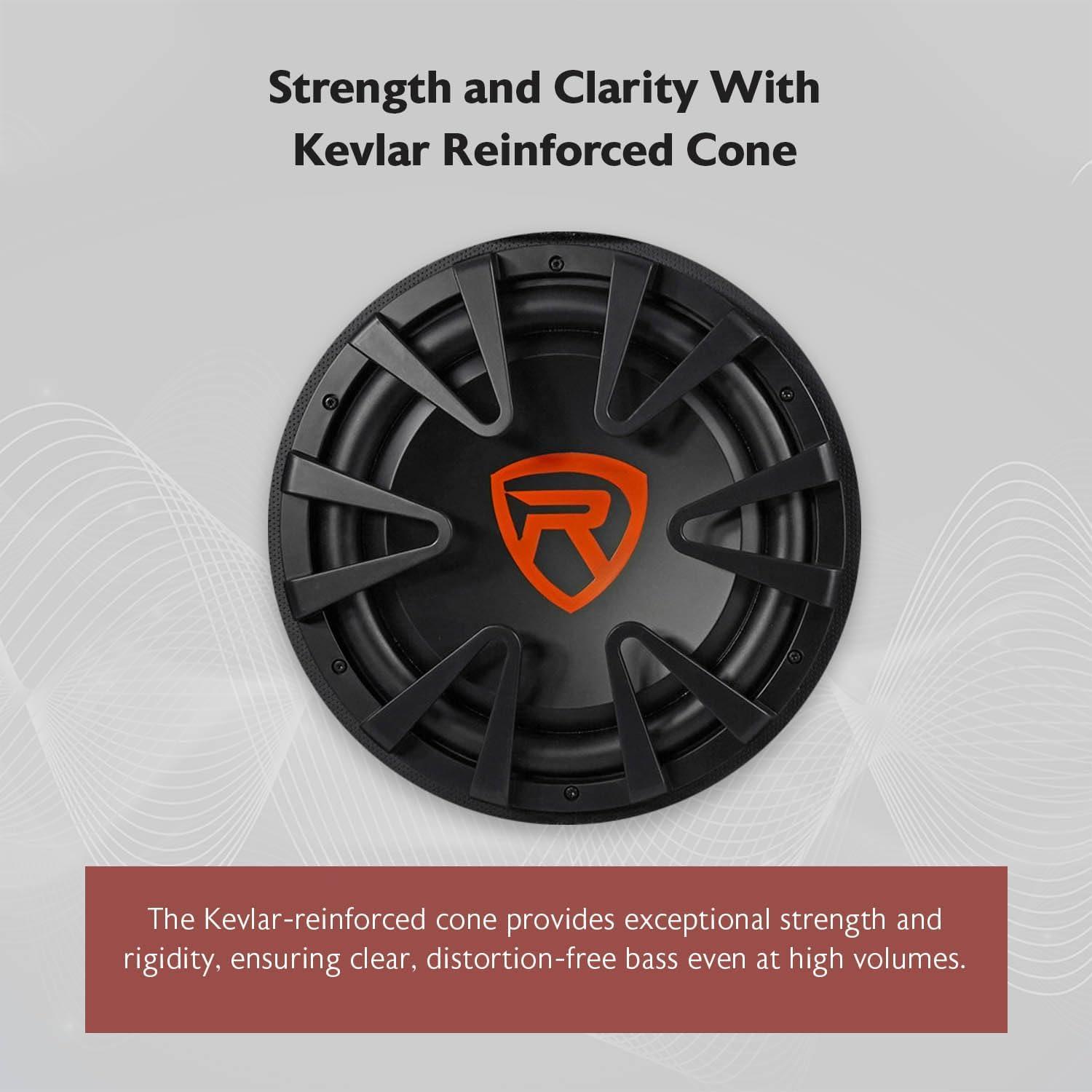 POWERFUL BASS OUTPUT: 1200W peak / 300W RMS with ultra-stiff composite pulp cone reinforced with Kevlar and 2″ high-temperature aluminum voice coil for deep, clear, distortion-free bass.