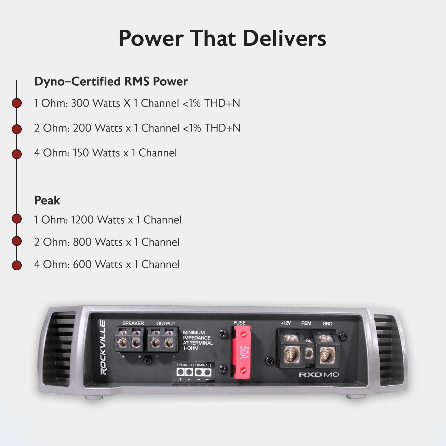 Dyno-Certified Power Output: Delivers 1200 Watt Peak, 300W RMS at 1 ohm, 200W RMS at 2 ohms, and 150W RMS at 4 ohms, ensuring reliable and accurate audio performance.