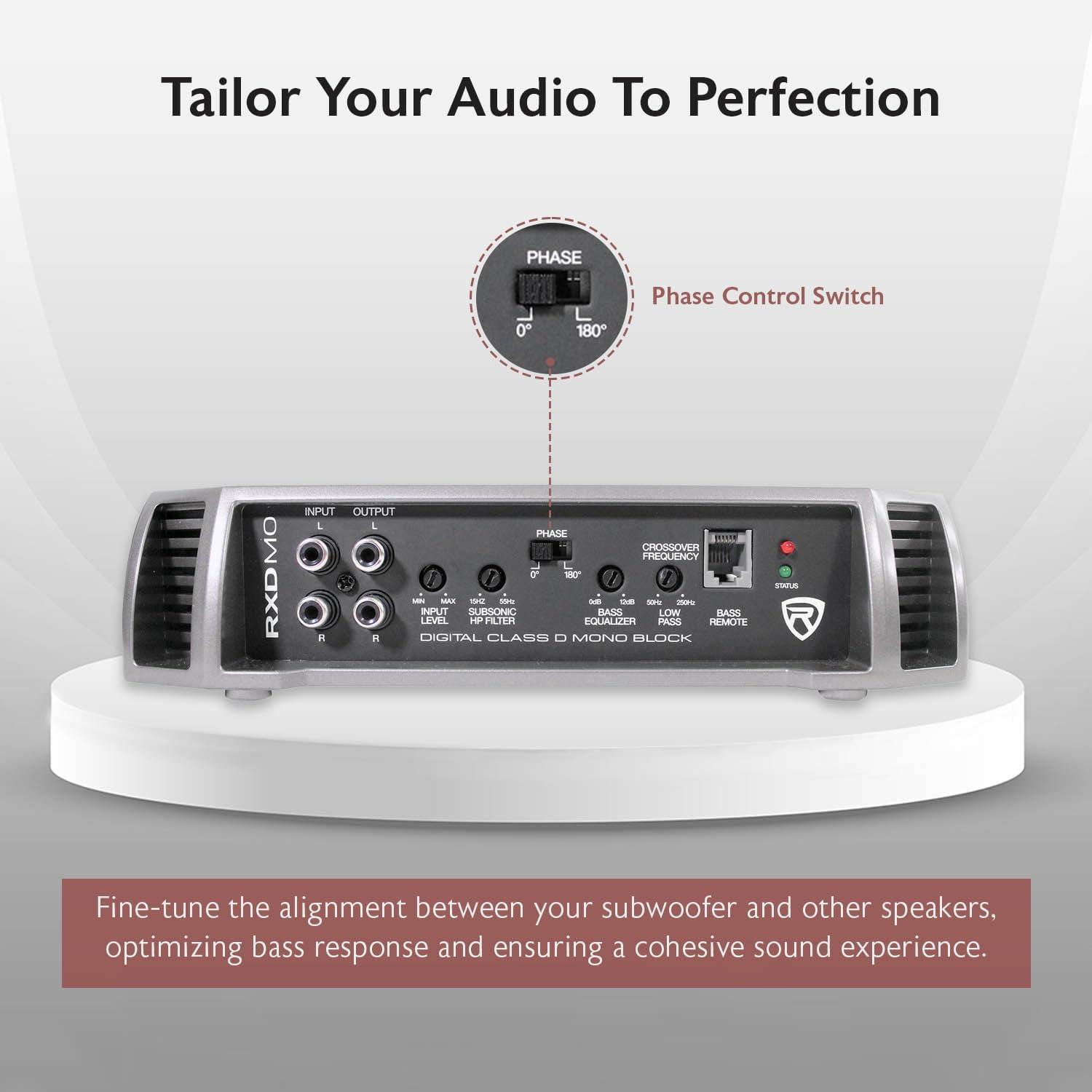 Advanced Sound Control: Features fully adjustable 12dB/octave crossover, subsonic filter (15Hz – 55Hz), and 12dB bass equalizer for precise audio tuning.