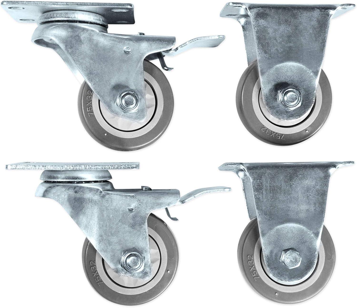 Swivel housing. Double ball race. Specifications: 3 Wheels. Height: 4.25. Mounting plate: 3.74 x 2.64. Mounting hole: 2.91 x 1.77. Net weight each fixed wheel: .99 lbs. Net weight each swivel wheel: 1.87 lbs. Gross weight of full set of (4) wheels: 6.17 lbs. Applications: DJ Speakers. PA Speakers. Karaoke speakers. Subwoofers. Studio monitors. Rack Cases. And Much More!