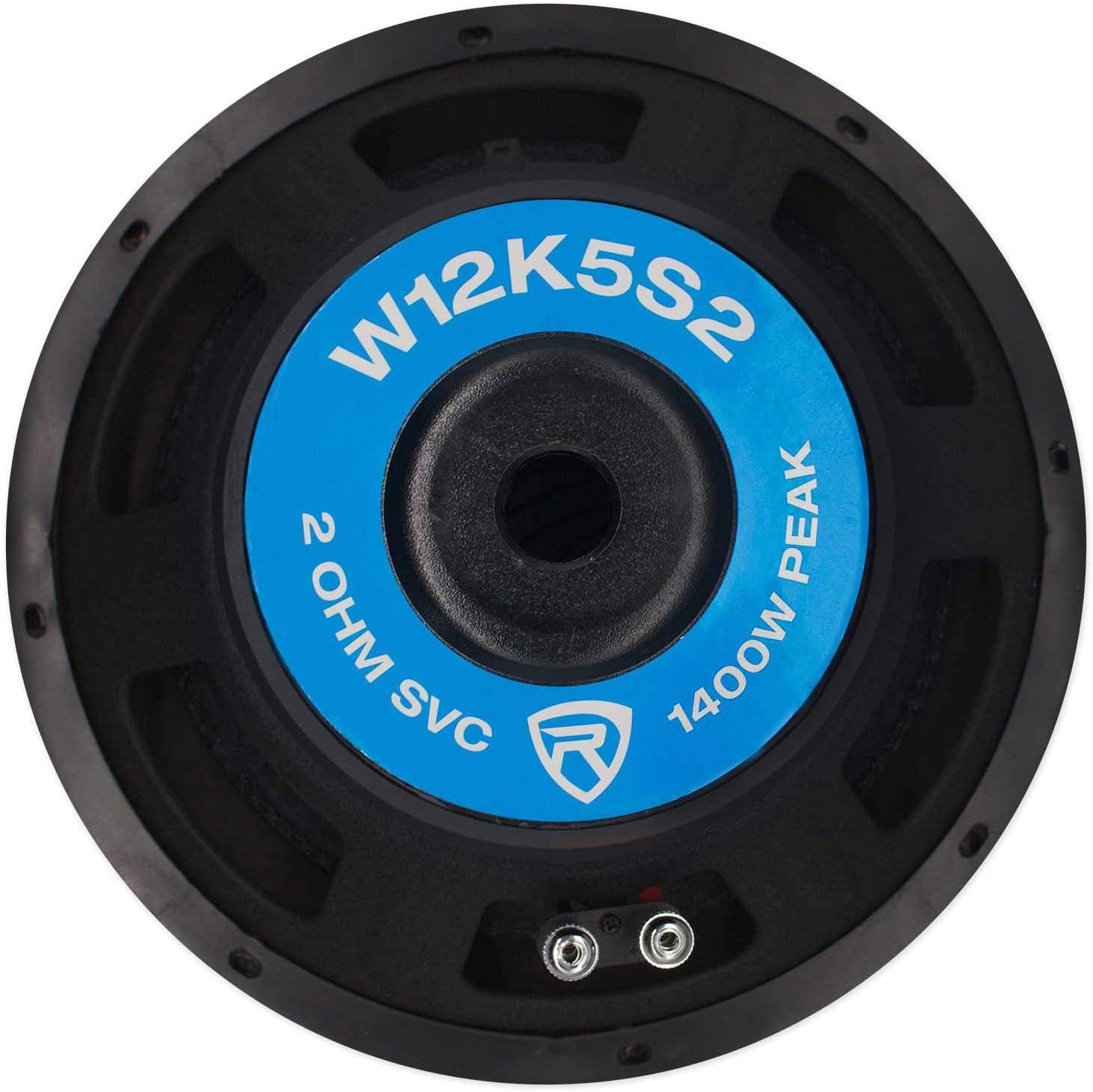 High-Output 12″ Subwoofer: The Rockville K5 W12K5S2 brings a CEA-rated 350-Watt RMS with 1400W peak in a 12″ package, featuring a 50 oz magnet, 2″ 4-layer aluminum voice coil wound with OFC 100% copper, cast iron basket, fiber reinforced non-pressed paper cone, thick foam surround, blue-stitched cone reinforcement, chrome-plated binding posts, 2-Ohm impedance, 11.02″ cutout diameter, 5.03″ mounting depth, 10.1 lbs weight, 88 dB sensitivity and 25 Hz-1.5 kHz frequency response.