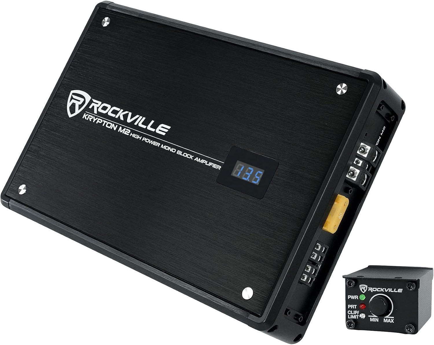 High-Current Amplifier – Rockville KRYPTON-M2 Mono Amp: Rockville KRYPTON-M2 mono amplifier supplies the headroom these subs demand with 3,000 Watts peak and 750 Watts RMS into 1 Ohm, selectable low-pass crossover, bass boost and remote bass level control. Conformal coated circuitry, heavy-duty power terminals and thermal/short protection ensure stable operation. This amp pairs with dual 2-Ohm subs in bridged or mono wiring to deliver clean, controlled low end at high SPL.