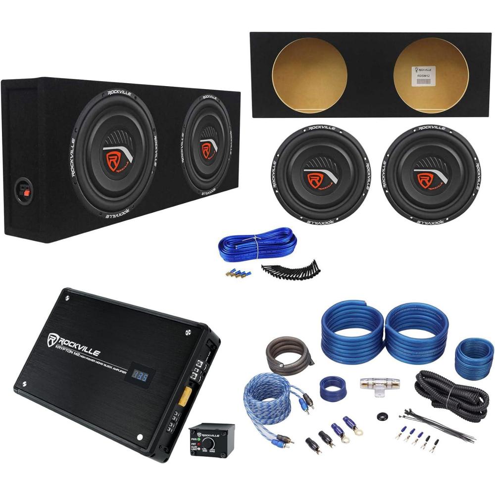 Rockville W12T4S2 Bundle: (2) 12" 1400W Peak/350W RMS 2-Ohm Shallow Mount Subwoofers, RDSM12 Dual 12" Sub Box, KRYPTON-M2 3000W 1-Ohm Mono Amplifier, RWK41 Amp Wiring Kit, K2 Installation Kit, 6-items