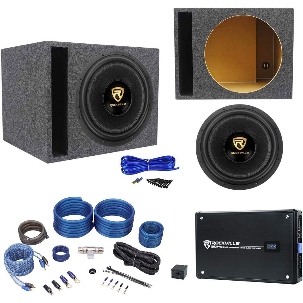 Package Includes: (1) Rockville W15K9D2 K9 Series 15″ Car Audio Subwoofer, (1) Rockville KRYPTON-M3 4000w Peak/1000w Dyno-Certified RMS Mono 1 Ohm Car Amplifier Amp+Remote, (1) Rockville RWK41 4 Gauge Complete Car Amp Wiring Installation Wire Kit with RCA's, (1) Rockville RSV15 15″ Vented Car Audio Subwoofer Box 2.6 Cubic Ft. Sub Enclosure, 10 Drywall Wood Screws, 12 Feet of 14 AWG Blue Speaker Wire, 2 Spade Terminals.