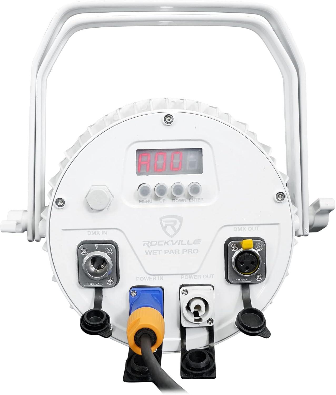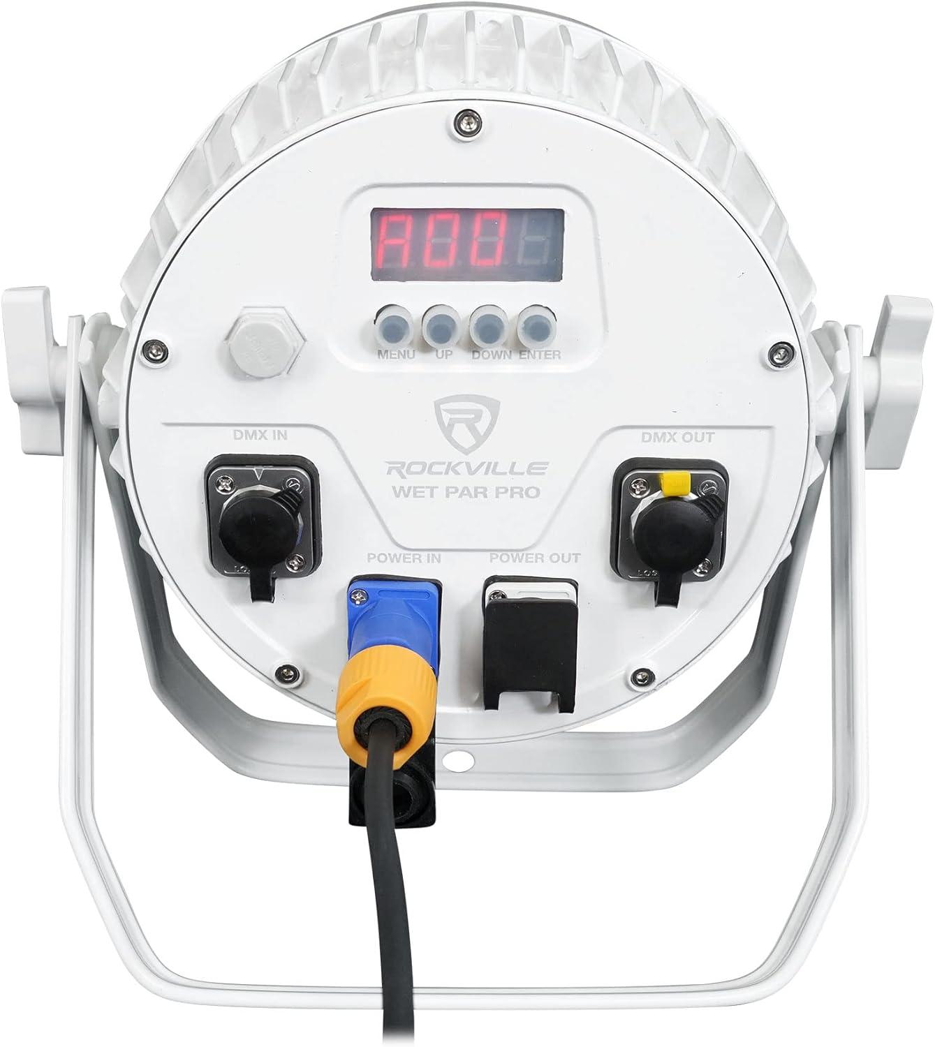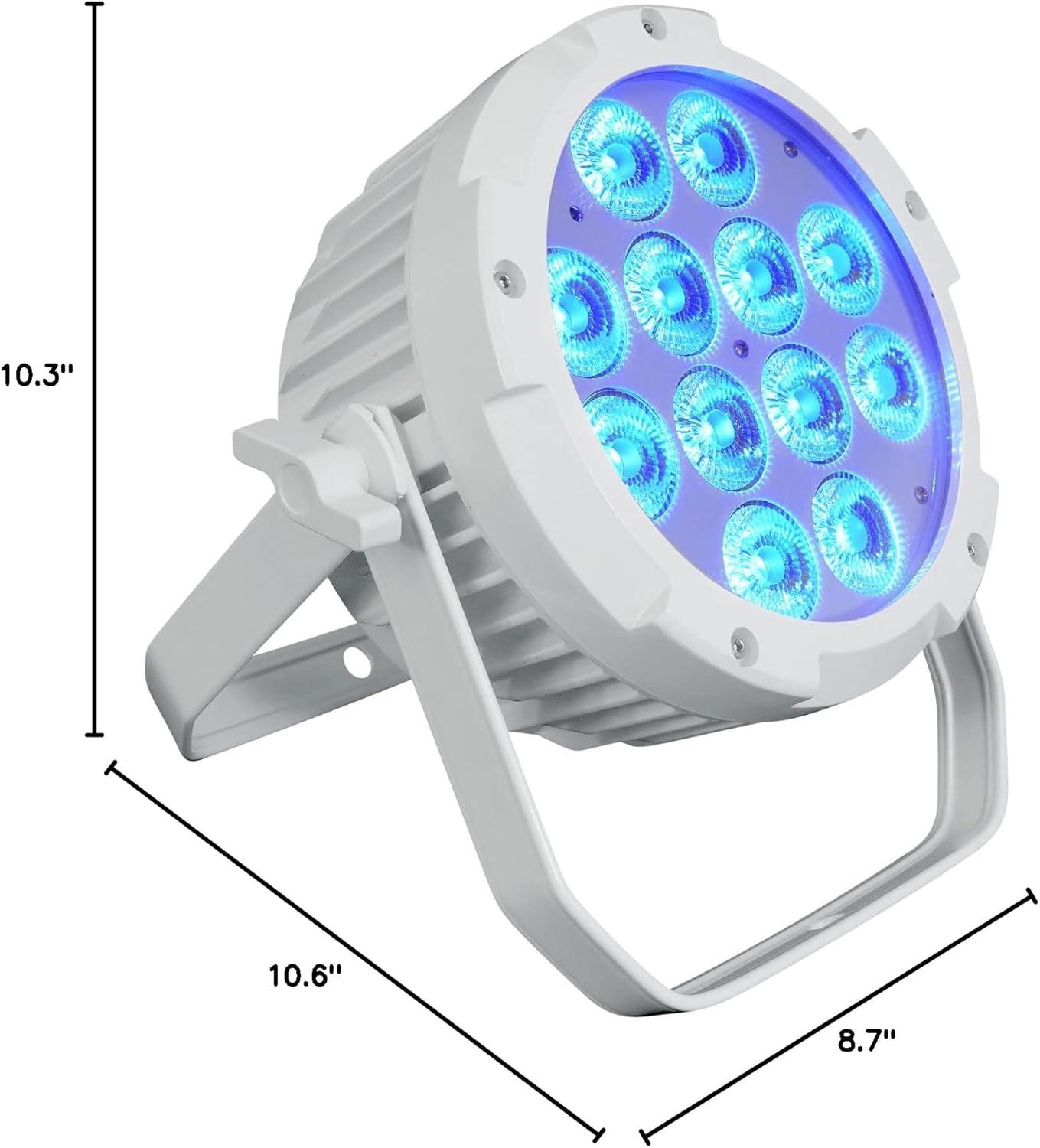 Description: The Wet Par Pro is a versatile and powerful water-resistant light that is perfect for outdoor or indoor use. Applications: Accent lighting for the exterior of your restaurant, club, building, or home. Outdoor or indoor stage lighting. Outdoor mood lighting for your party. Any other application that you need a powerful DMX up-light. What makes the Wet Par Pro special? All the inputs and outputs are sealed so they will not get damaged by water. You can use these indoors or outdoors. You can keep these outdoors 24/7 in the rain, wind, snow and they will survive for many years.. These are some of the brightest and most powerful par lights we ever manufactured. They are just incredibly bright making them perfect for exterior lighting of a commercial building, restaurant, etc. They are also perfect for changing the color and mood of a stage during your performance. What is really cool is that they have an adjustable 15 or 45 degree angle. This means you can use it for multiple applications to get the desired effect you want.. These have 6 in 1 RGBWA+UV bulbs. You can get bright and vibrant colors because you can color mix with red, green, blue, white, amber, and UV black light combinations. This makes for 16.7 million different colors.. The DMX modes allow you to control 6, or 10 channels. So whether you have a simple DMX controller or an advanced one, we got you covered.. We include a remote so if you want to just set it with a simple remote you can do that.. We have all the different standard modes you would expect such as static, strobe, fade, and sound activated.. The build quality of this light is so good. It is made of aluminum and the light is heavy weighing in at around 10 lbs. The light is actually not that thick though. It is one of the thinnest lights that you can get with this kind of power. Even the dual bracket is extremely thick and sturdy.